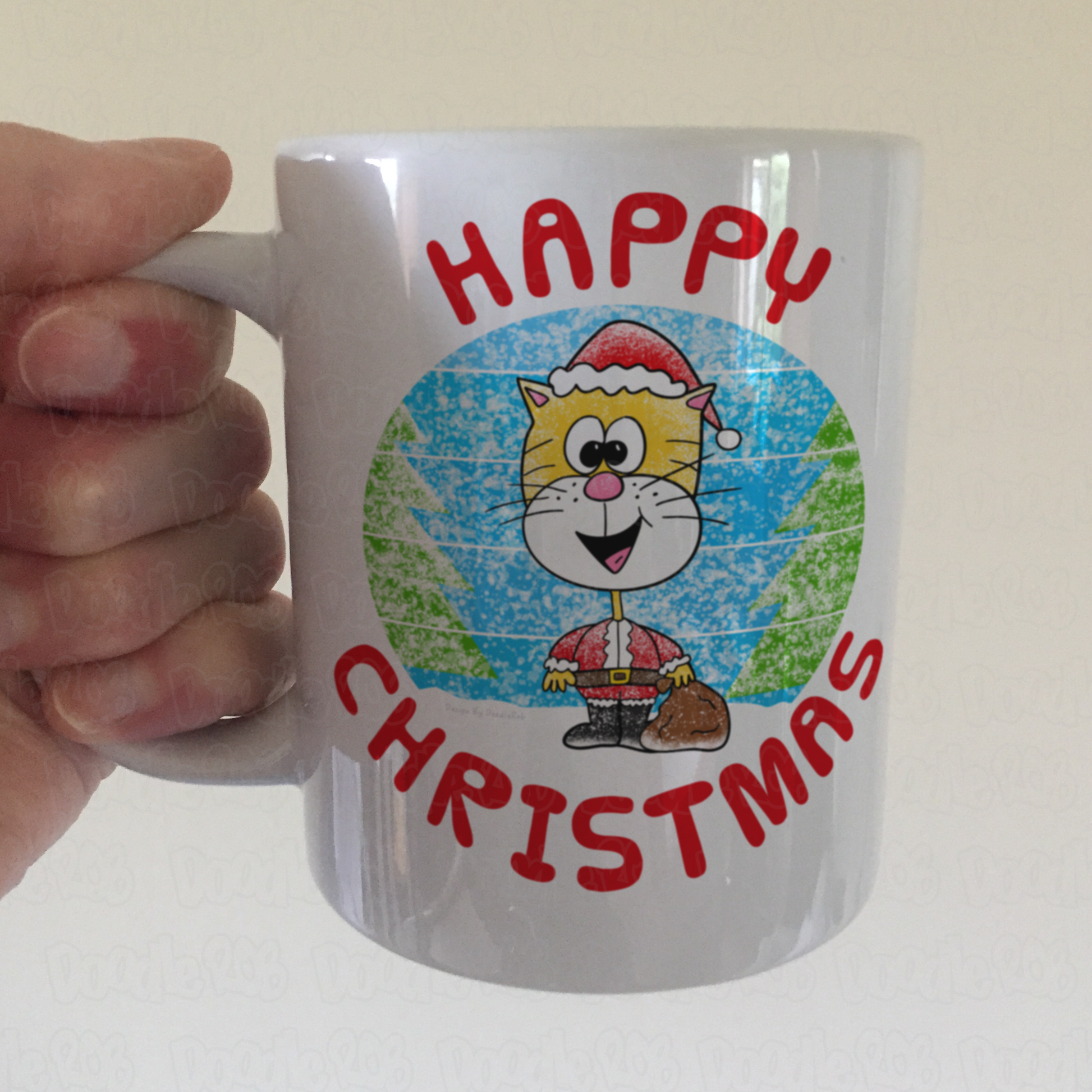 This cat Christmas mug features my doodle of a cat (dressed as Santa), with snow and the text, "Happy Christmas"! Ideal for family and friends who love cats, this mug is the perfect Christmas gift!