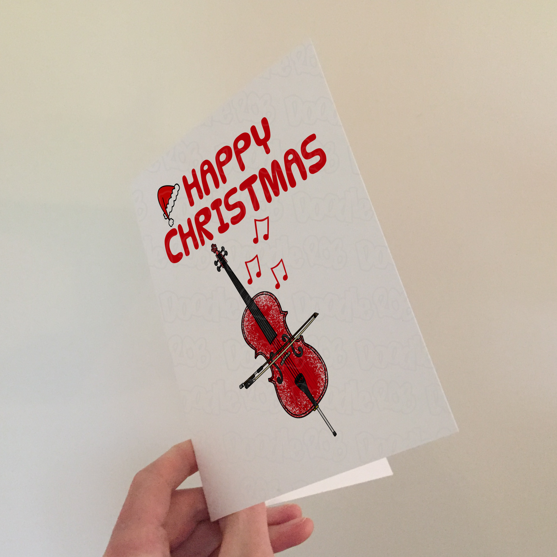 This cello Christmas card features my doodle of a cello, with snow, Santa hat and the text "Happy Christmas"! Ideal for cello players (cellists, cello teacher, string player) and orchestral music lovers!