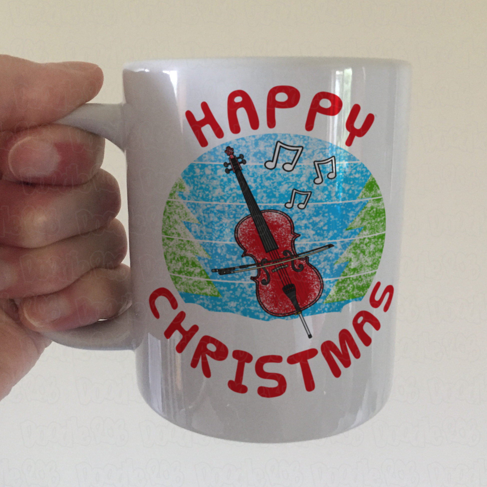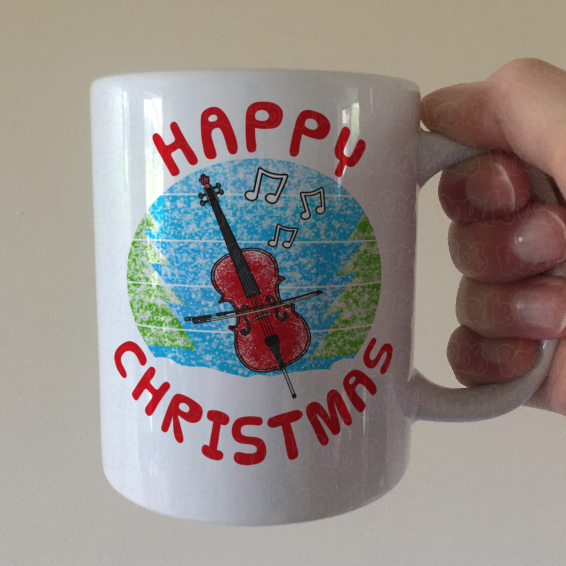 This Christmas cello mug features my doodle of a cello, with snow and the text "Happy Christmas"! Ideal for family and friends who play cello (cellist, cello teacher, string musician), this cello mug is the perfect Christmas gift!
