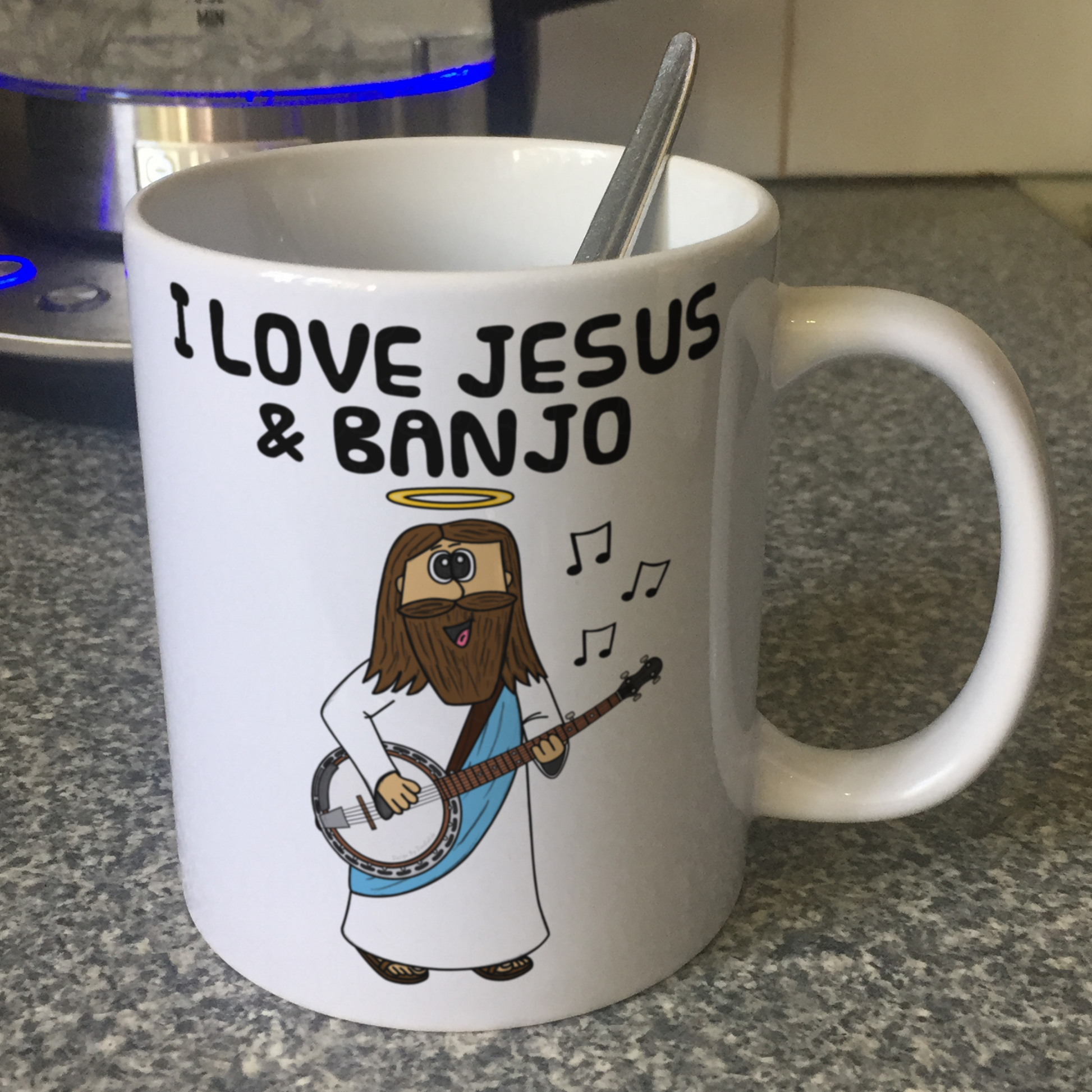 This Christian banjo mug features my doodle of Jesus playing banjo, with musical notes and the text, "I Love Jesus & Banjo"! Ideal for Christian family and friends who play banjo or love music, this mug is the perfect gift!