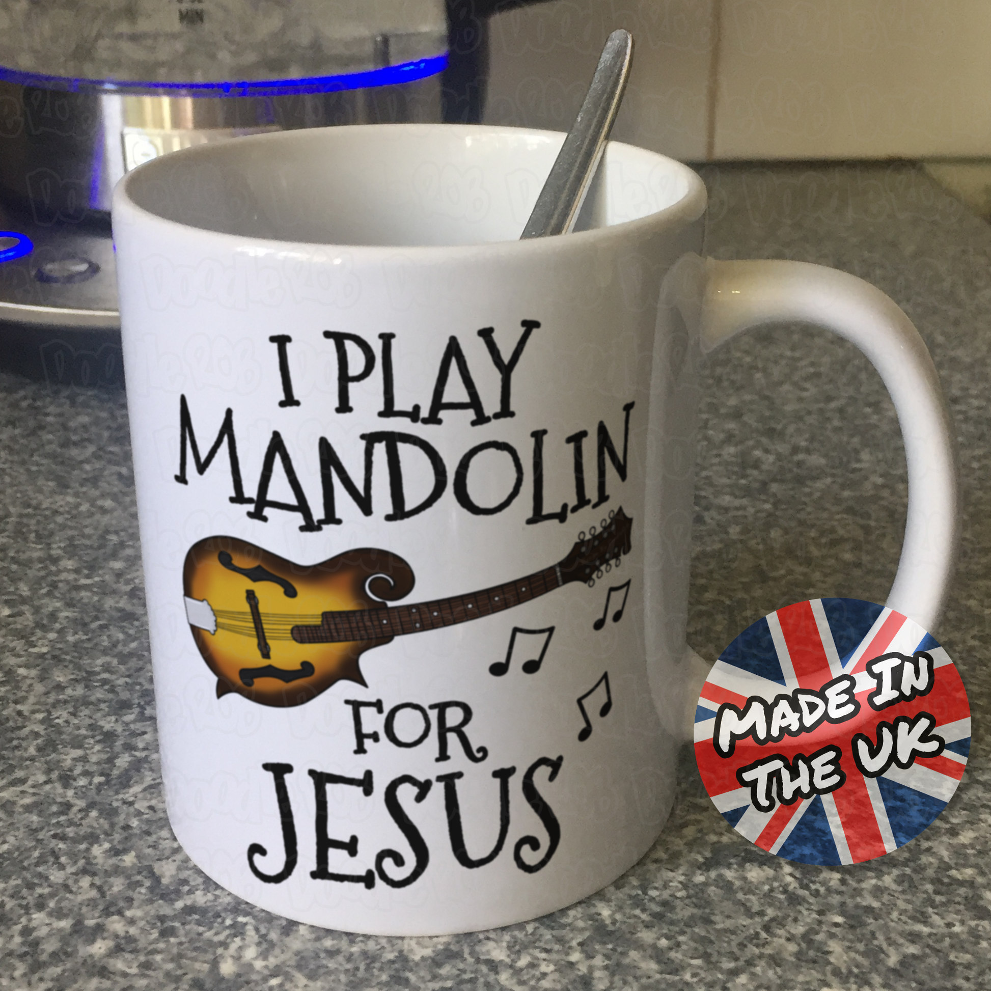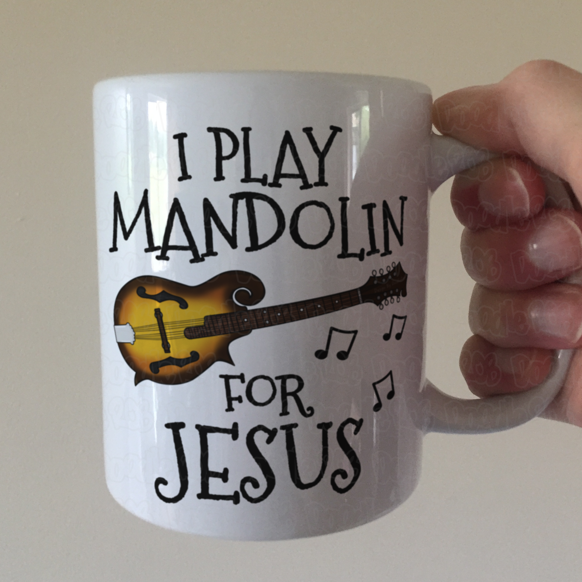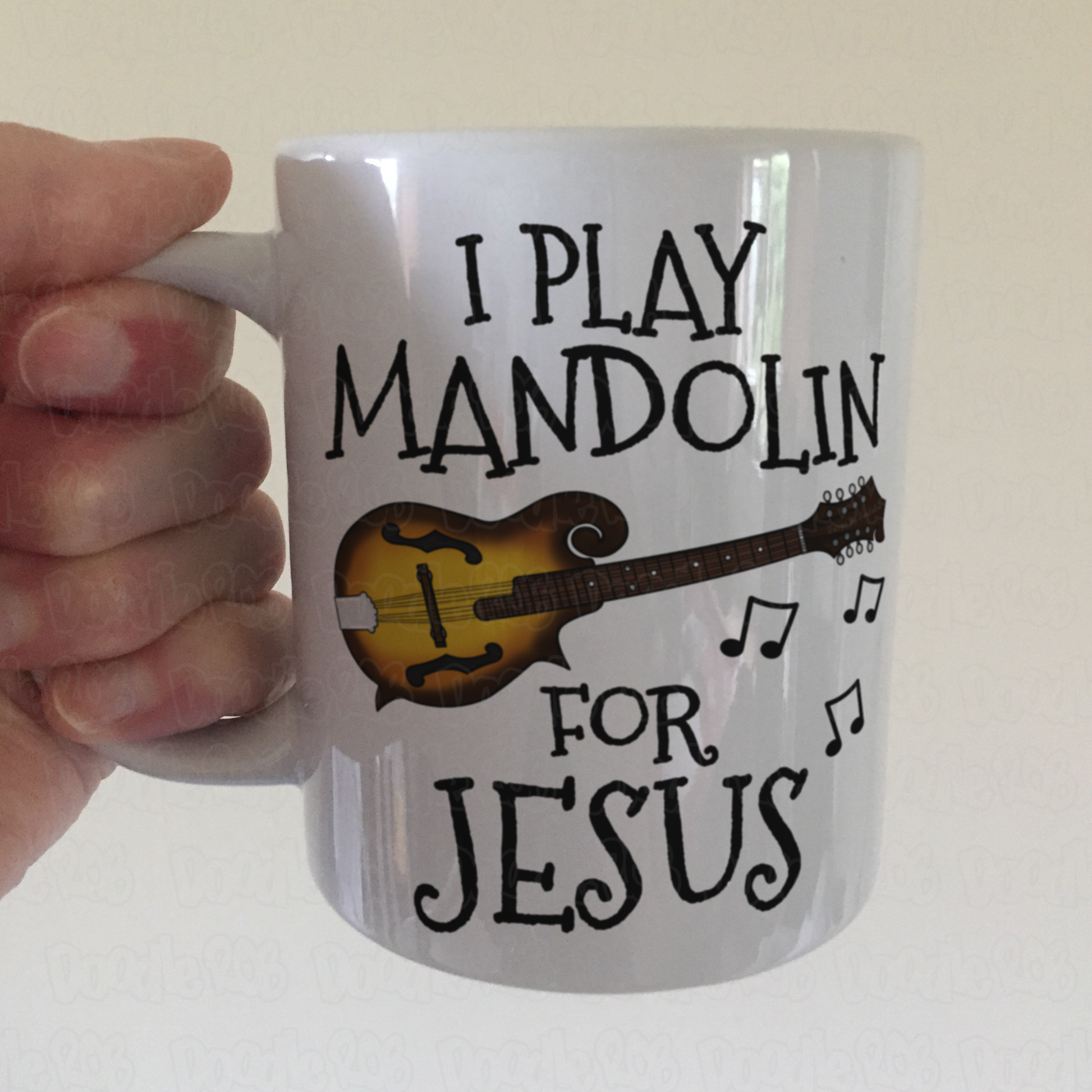 This church mandolin mug (Christian mandolin player mug) features my doodle of a mandolin, with musical notes and the text, "I Play Mandolin For Jesus"! Ideal for Christian family and friends who play mandolin (mandolinist, worship leader, church musician), this mug is the perfect gift for birthdays, church events or any other occasion!