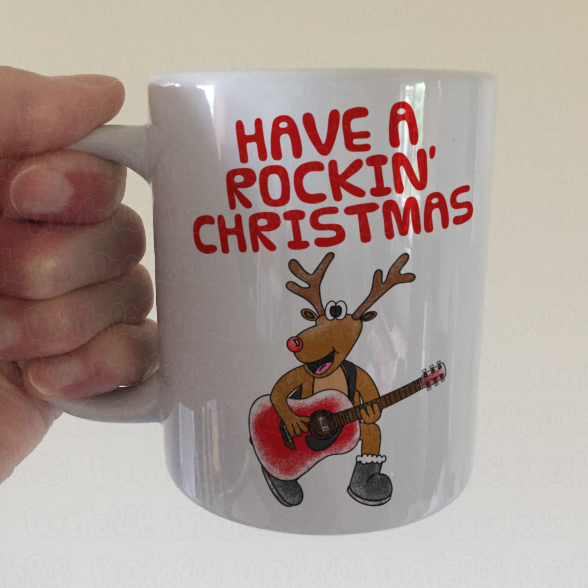 This Christmas guitar mug features my doodle of Rudolf The Reindeer playing acoustic guitar, with the text "Have A Rockin' Christmas"! Ideal for anyone who plays guitar (acoustic guitarist, guitar teacher, songwriter) or loves music, this guitar Xmas mug is the perfect Christmas gift!