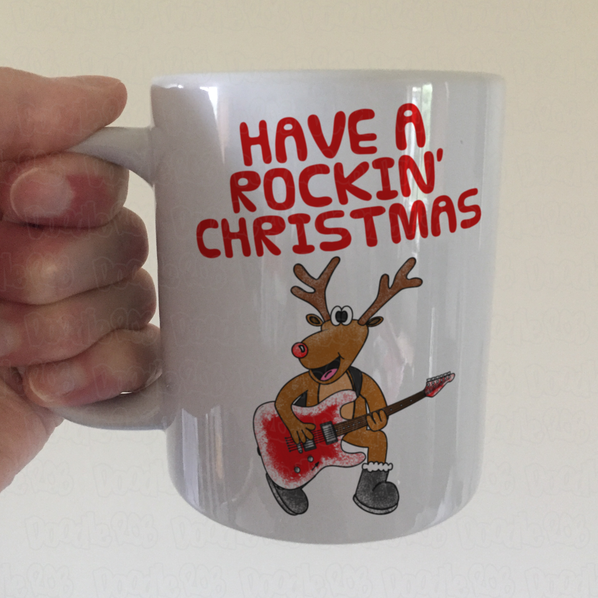 This Christmas Guitar mug features my doodle of Rudolf The Reindeer playing electric guitar, with the text "Have A Rockin' Christmas"! Ideal for anyone who plays guitar (electric guitarist, guitar teacher, guitar student, rock musician) or loves rock music, this guitar Xmas mug is the perfect Christmas gift!