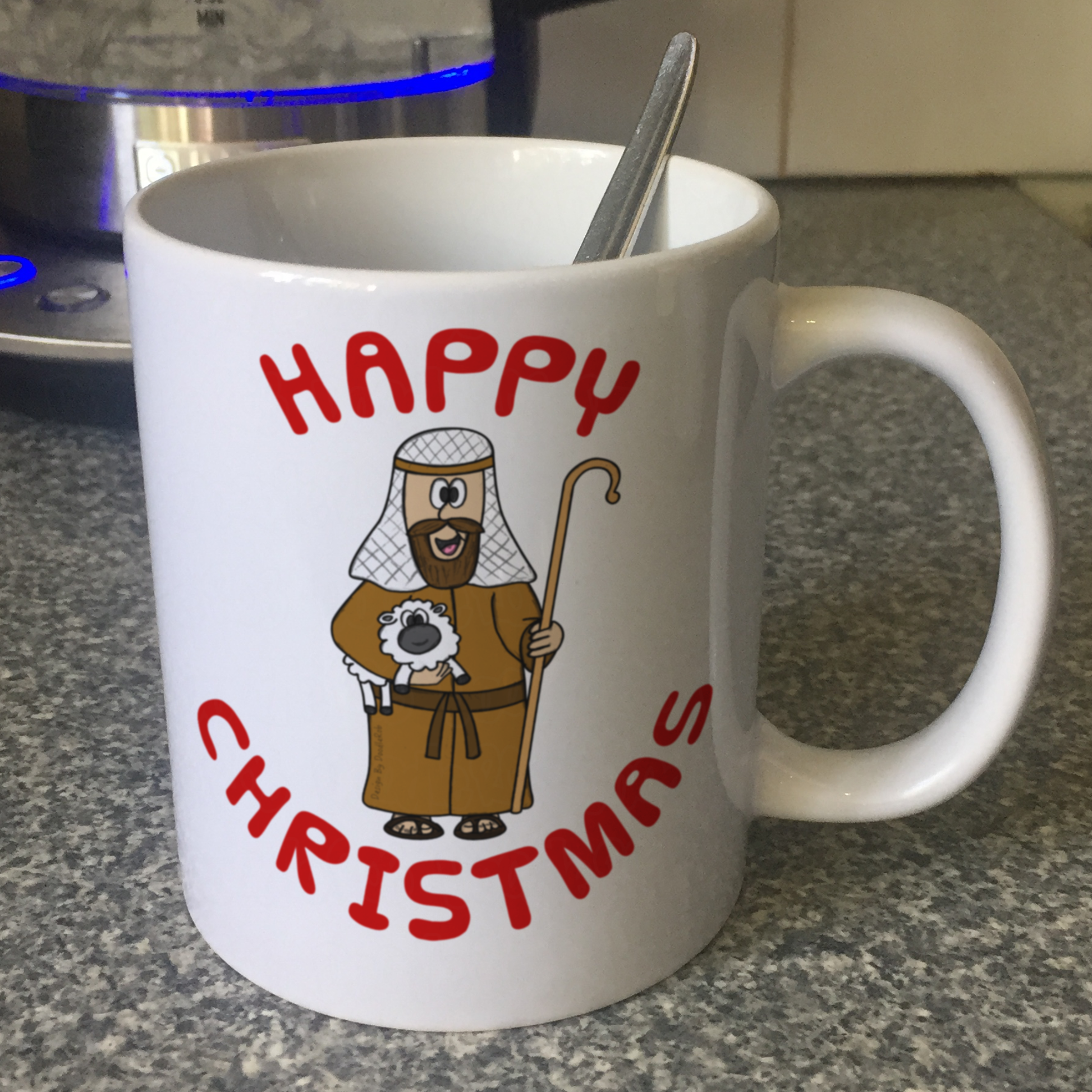 This Christmas shepherd mug features my doodle of a Christmas shepherd (holding a lamb and a crook) and the text "Happy Christmas"! Ideal for family and friends who love the Christmas Nativity (especially carol singers, church friends, Christian ministers and teachers running Christmas Nativity plays), this mug is the perfect Christmas gift!