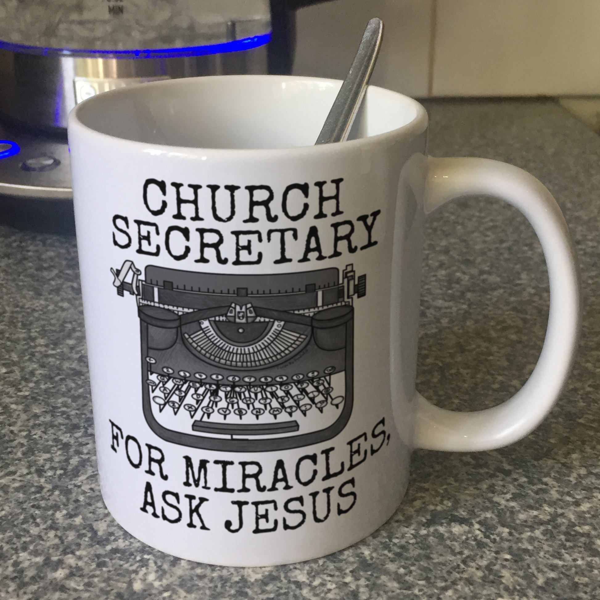 This funny church secretary mug features my doodle of a typewriter, with the text "I'm Church Secretary - For Miracles, Ask Jesus"! Ideal for church secretaries and administrators, this funny church mug is the perfect gift for birthdays, church events or any other occasion!