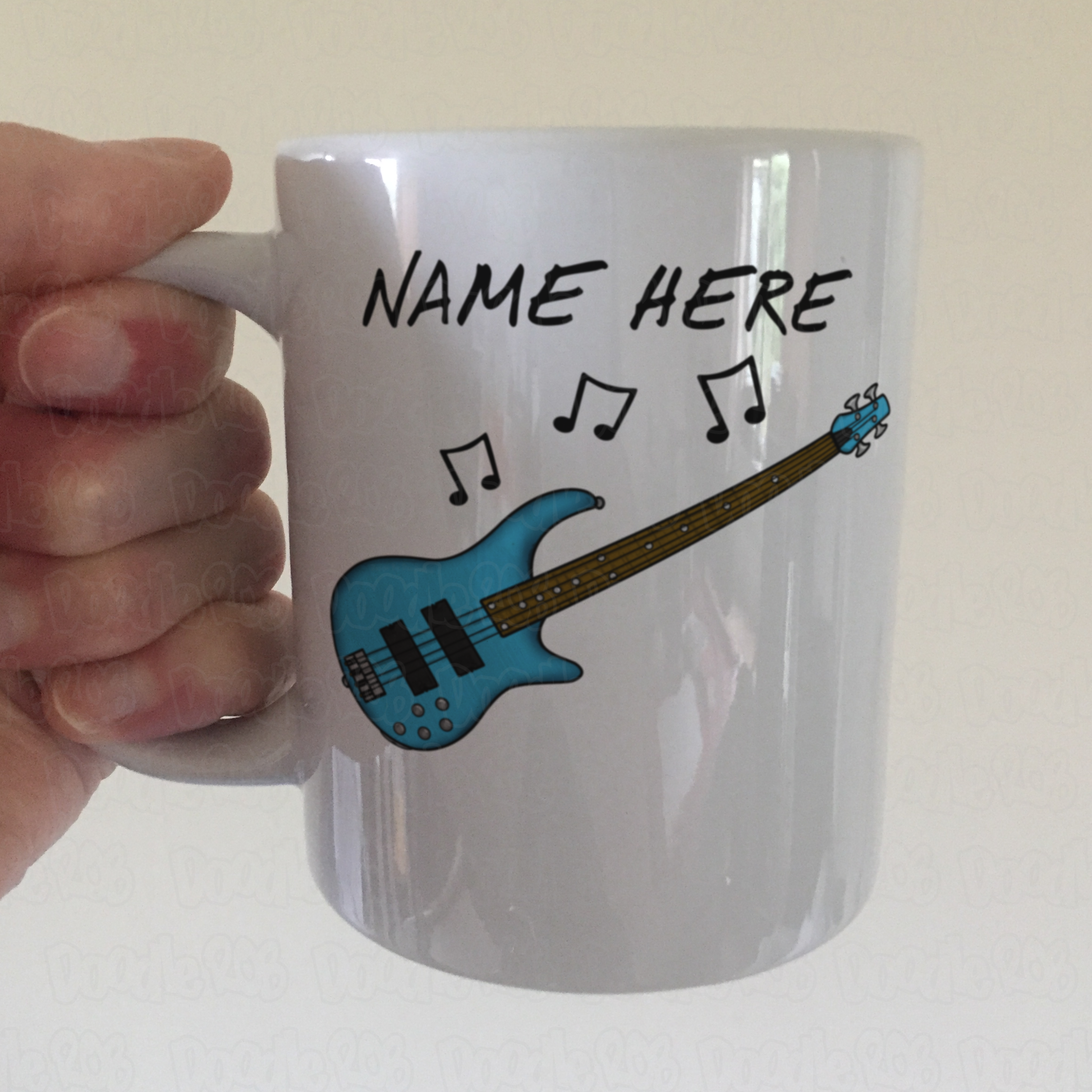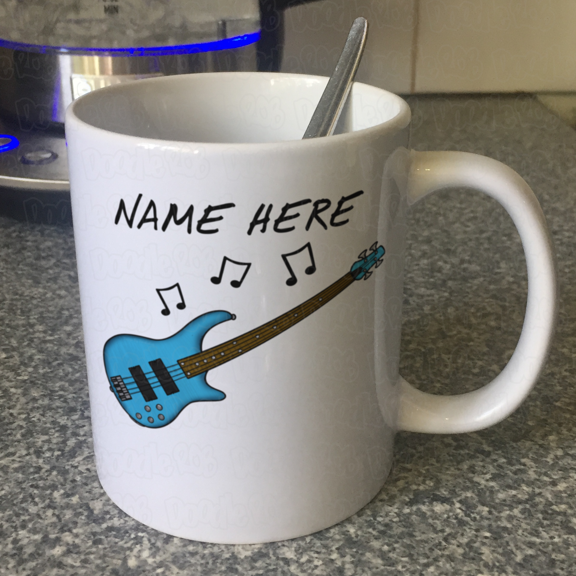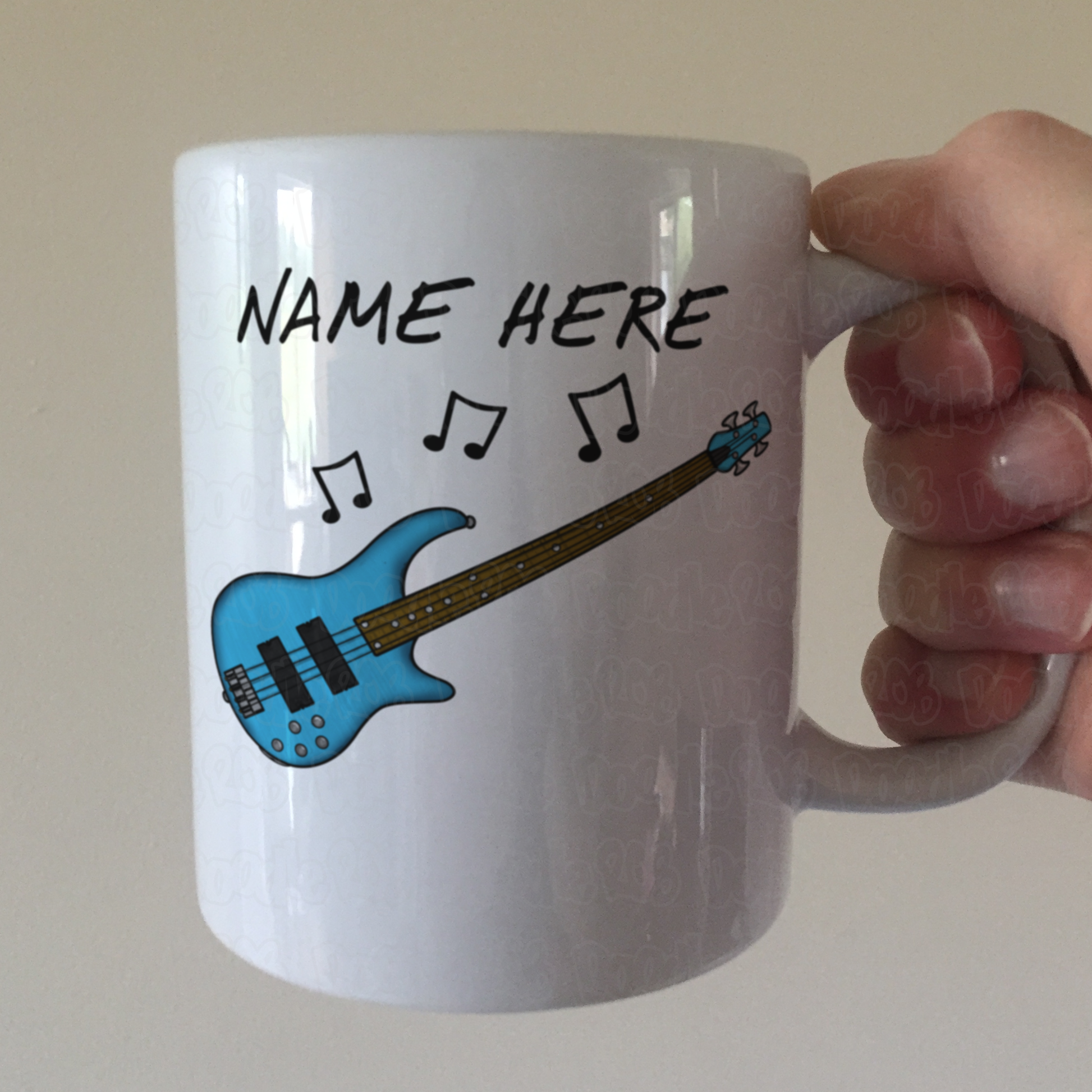 This bassist personalised mug features my doodle of a bass guitar (in blue), with musical notes and personalised text! Ideal for bass guitarists (bassist, bass teacher, music teacher, rock musician) and music lovers, this mug is the perfect gift for birthdays, teacher thank you, music exams, or any other occasion!