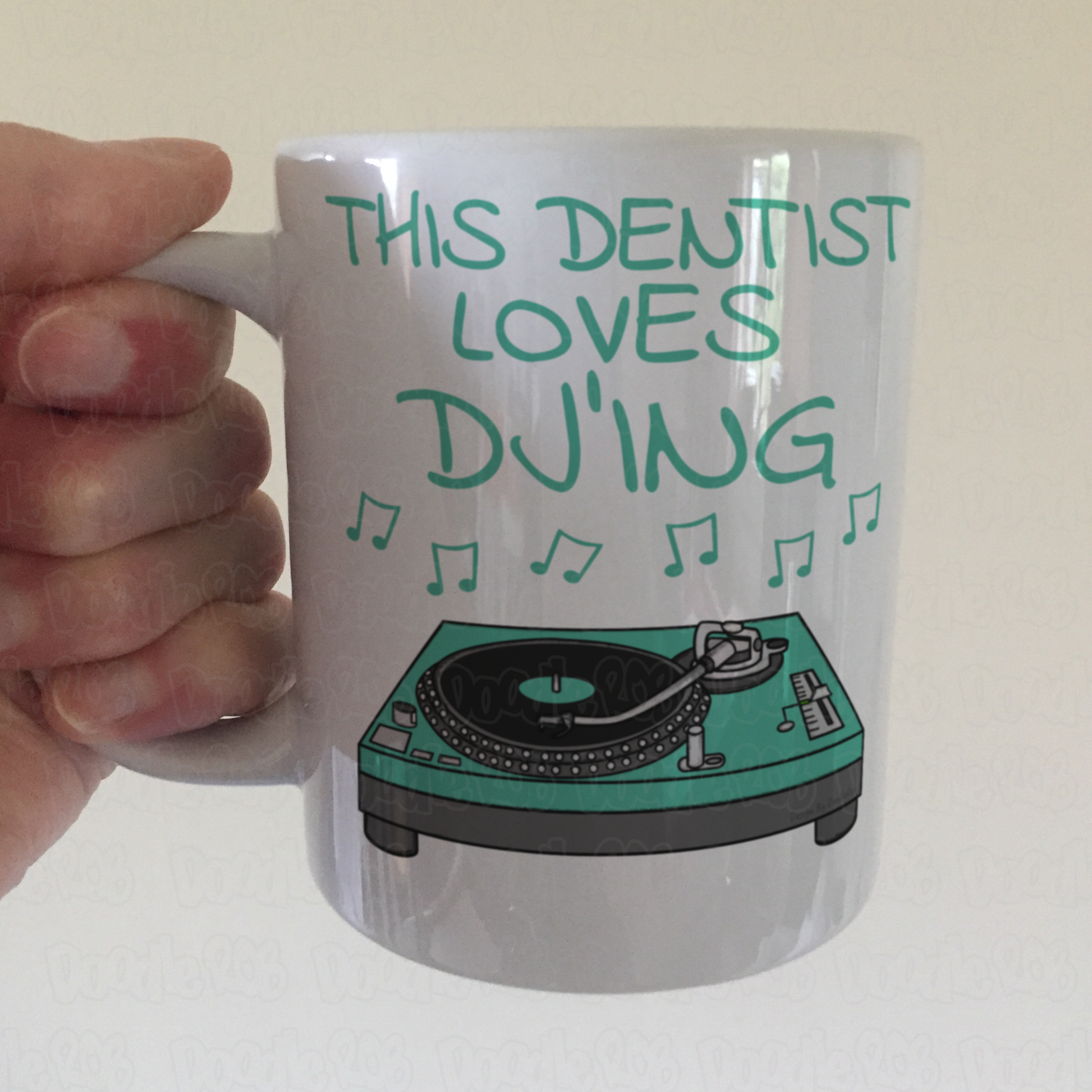 This dentist DJ mug features my doodle of a DJ turntable with the text, "This Dentist Loves DJ'ing"! The ideal gift for a dentist who loves music!