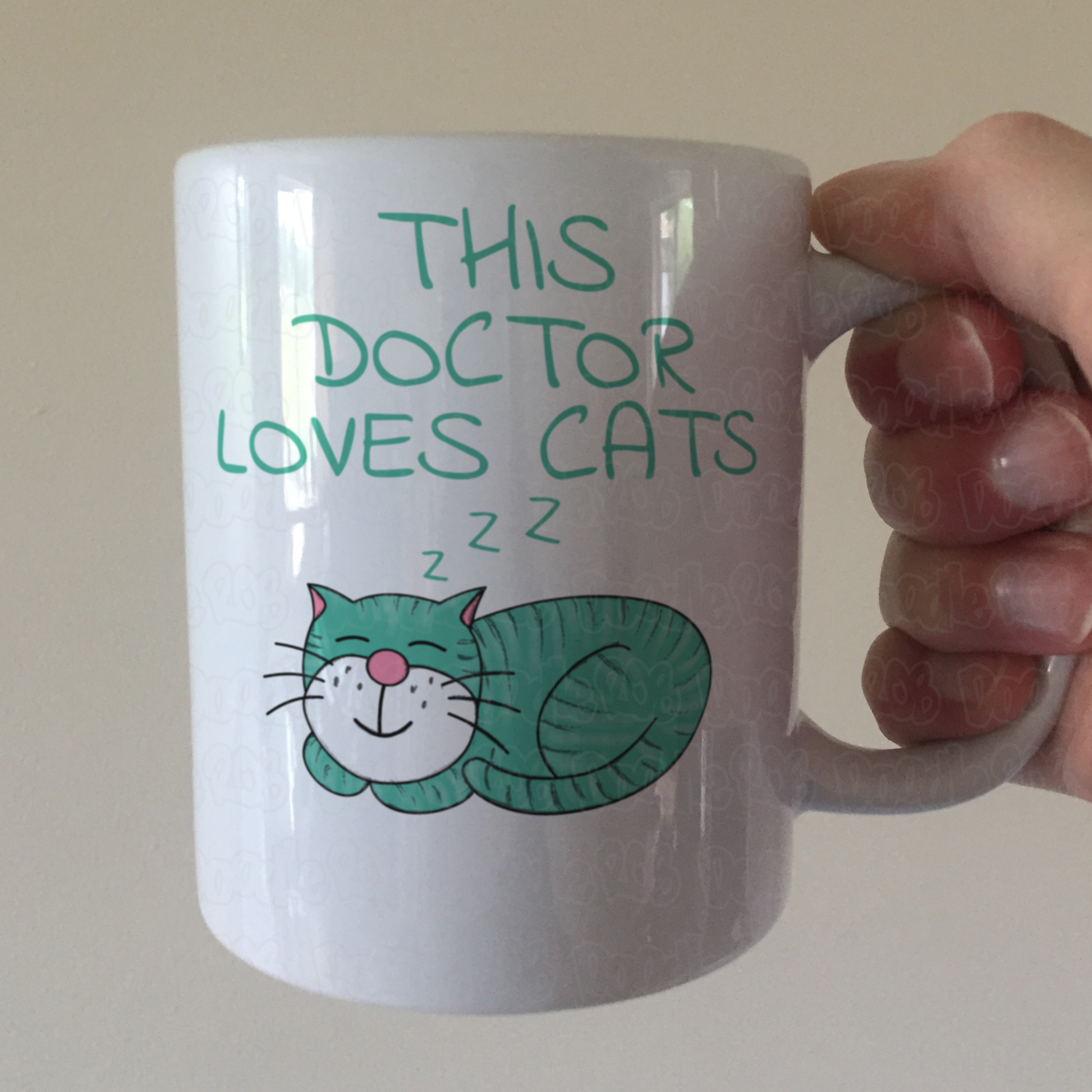 This doctor cat mug features my doodle of a sleeping cat with the text, "This Doctor Loves Cats"! The ideal gift for a doctor who loves animals!