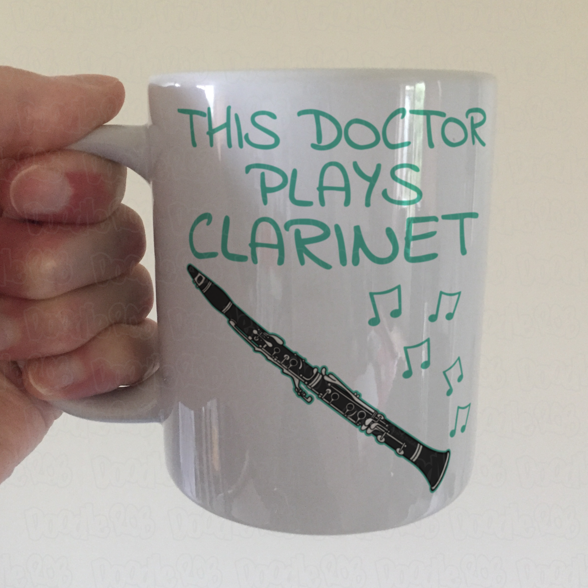This doctor clarinet mug features my doodle of a clarinet with the text, "This Doctor Plays Clarinet"! The ideal gift for a doctor who loves music!