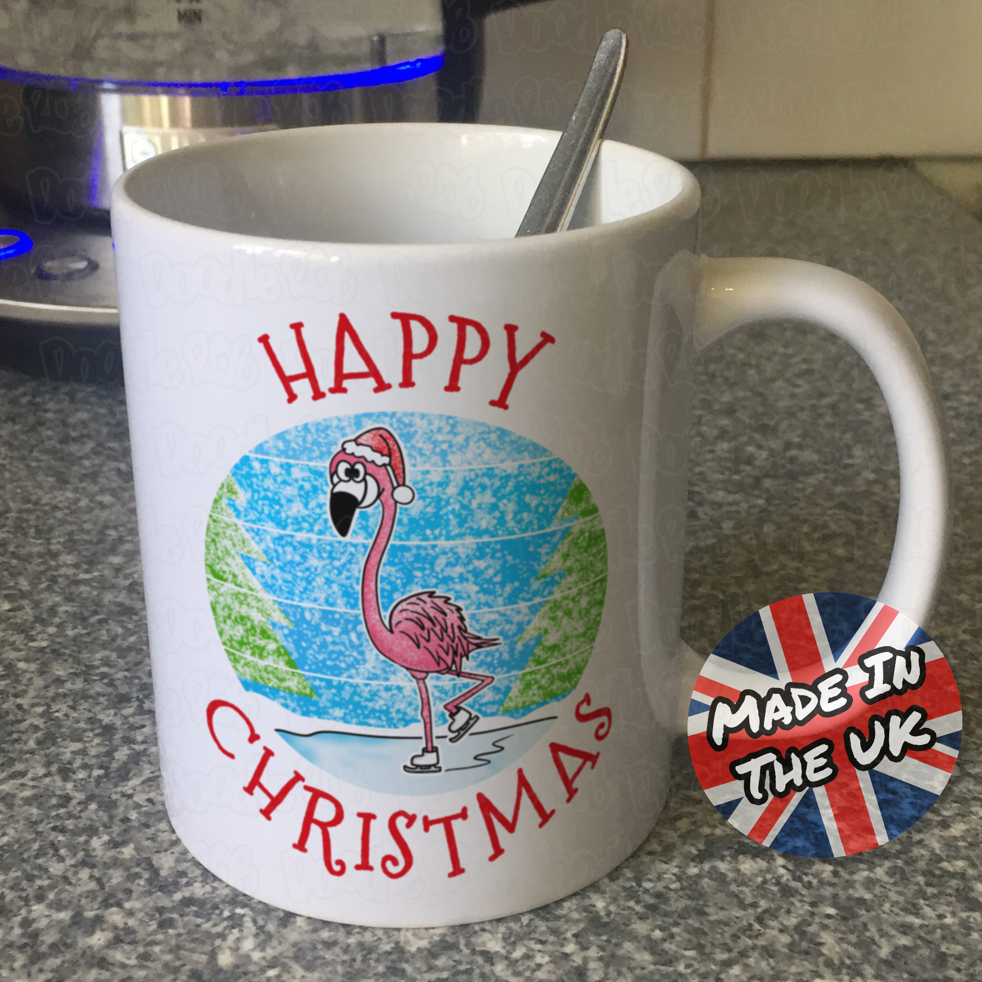 This flamingo Christmas mug features my doodle of a flamingo wearing a Santa hat and ice skating, with the text "Happy Christmas"! Ideal for family and friends who love wildlife, this flamingo mug is the perfect Christmas gift!