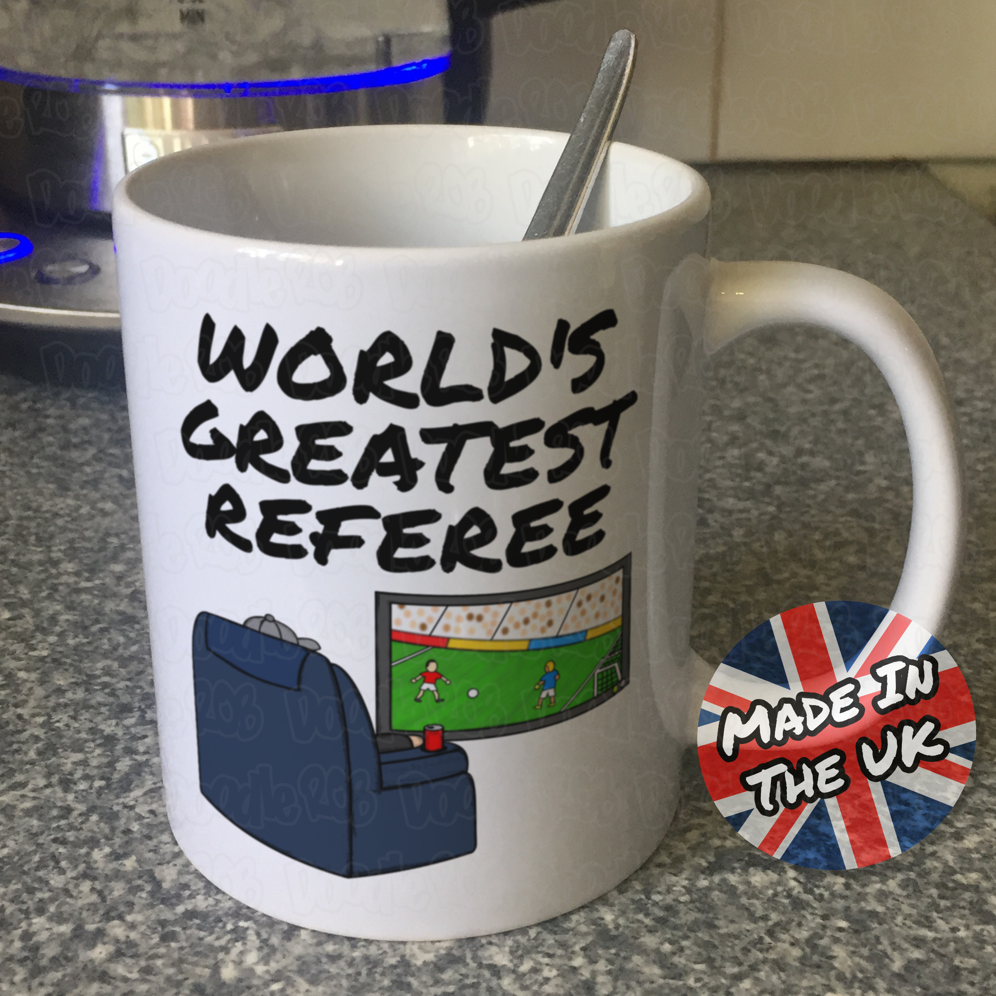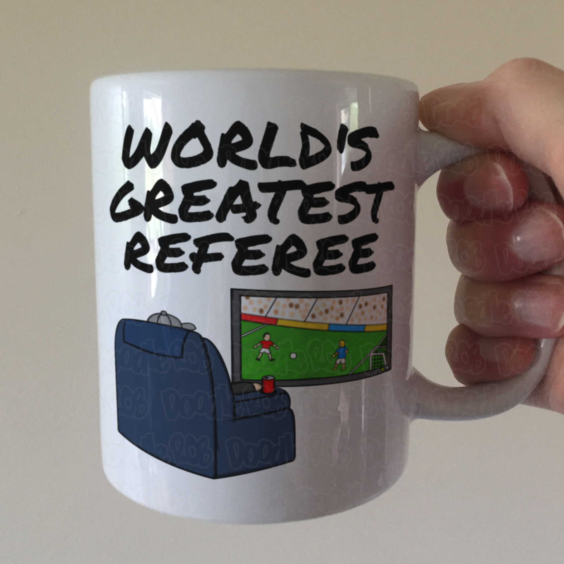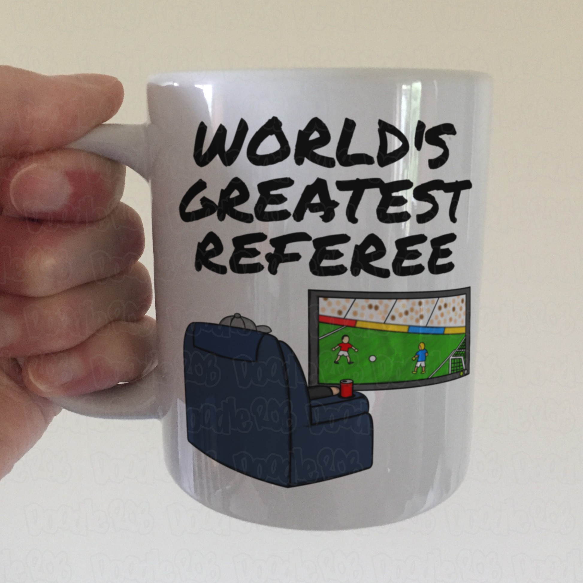 This football referee mug features my doodle of someone watching soccer on TV, with the text "World's Greatest Referee"! Ideal for family and friends who love football, this funny football mug is the perfect gift for birthdays, retirement, or any other occasion!