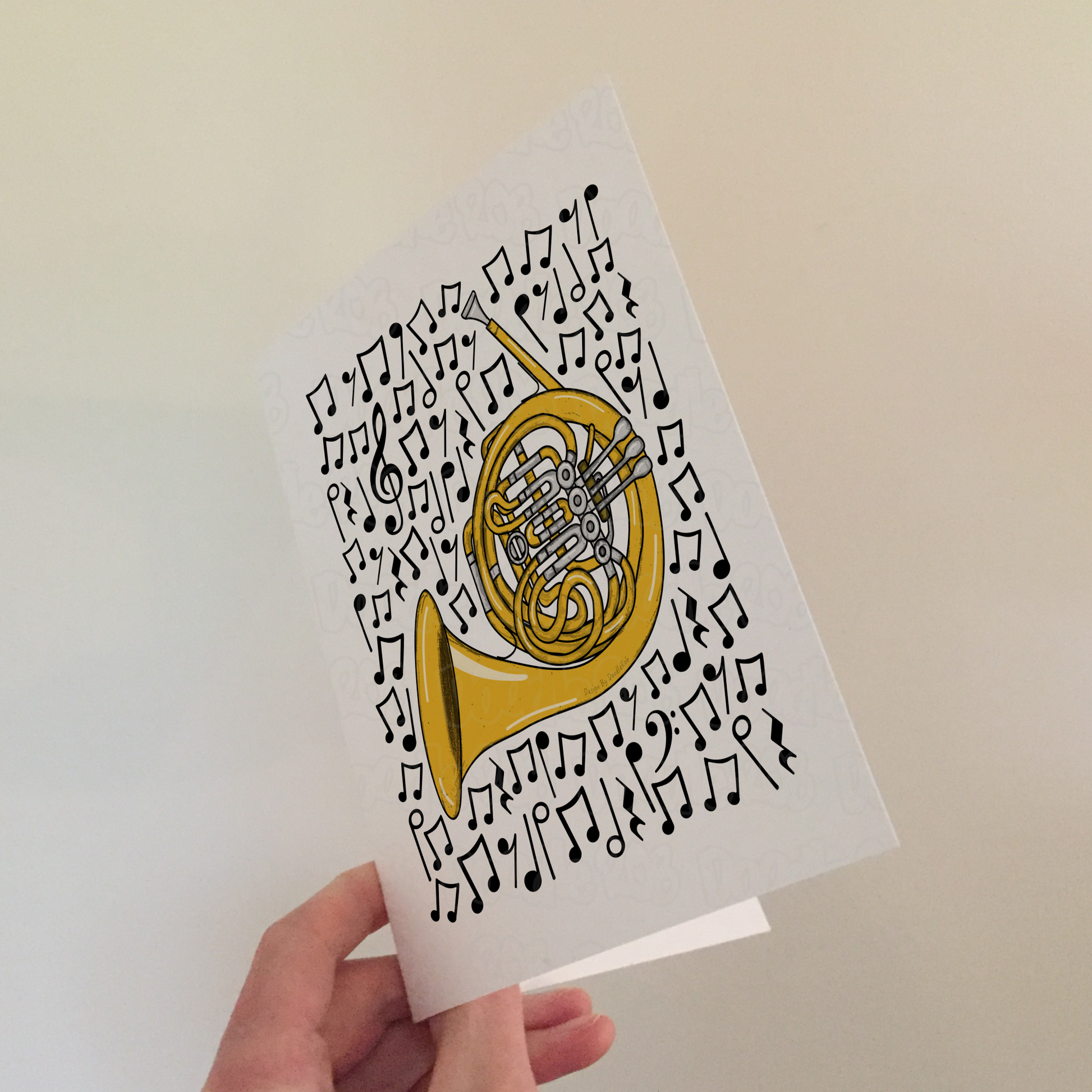 This french horn greeting card features my doodle of a french horn, surrounded by musical notes! Ideal for horn players (hornist, french horn teacher, brass teacher, brass player) and orchestral music lovers! Blank inside for your own message, this card is perfect for birthdays, teacher thank you, music exams, or any other occasion!