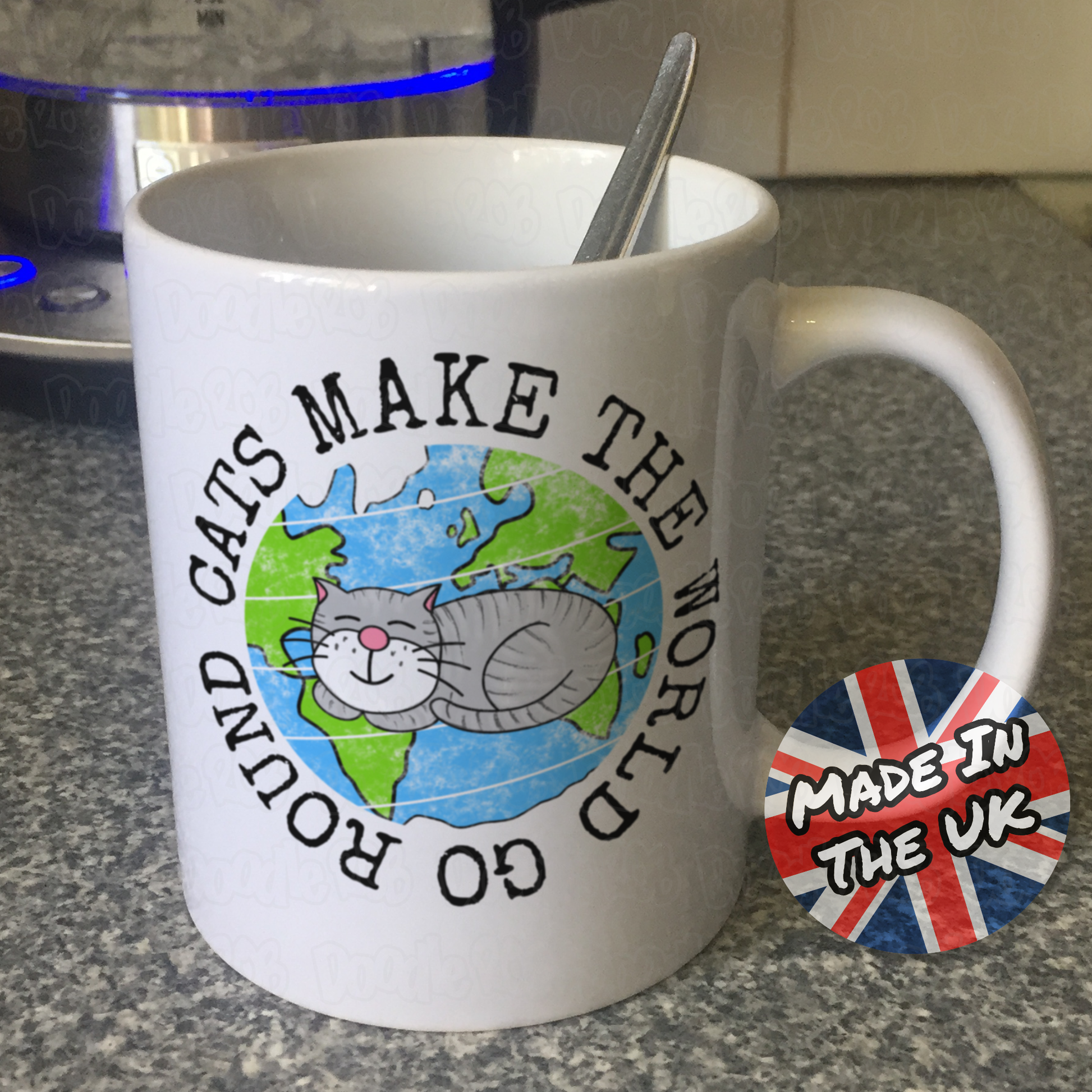 This funny cat mug features my doodle of sleeping cat, with the world and the text "Cats Make The World Go Round"! Ideal for family and friends who love cats and have a sense of humour, this funny mug is the perfect gift for birthdays, Earth Day, or any other occasion!