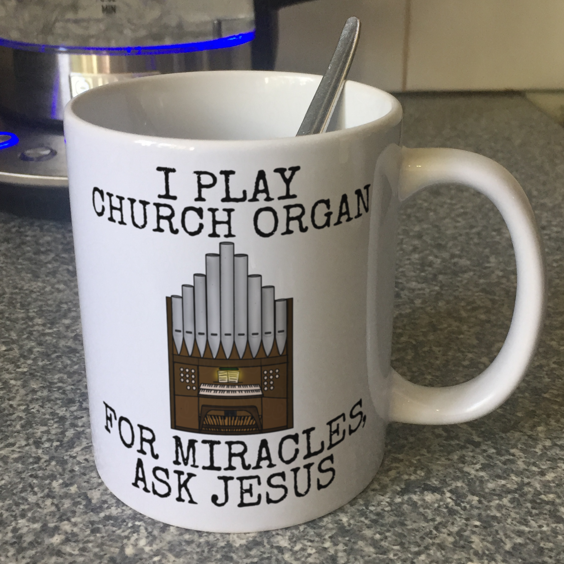 This funny church organist mug features my doodle of a church organ, with the text "I Play Church Organ - For Miracles, Ask Jesus"! The perfect gift for birthdays, church events or any other occasion!