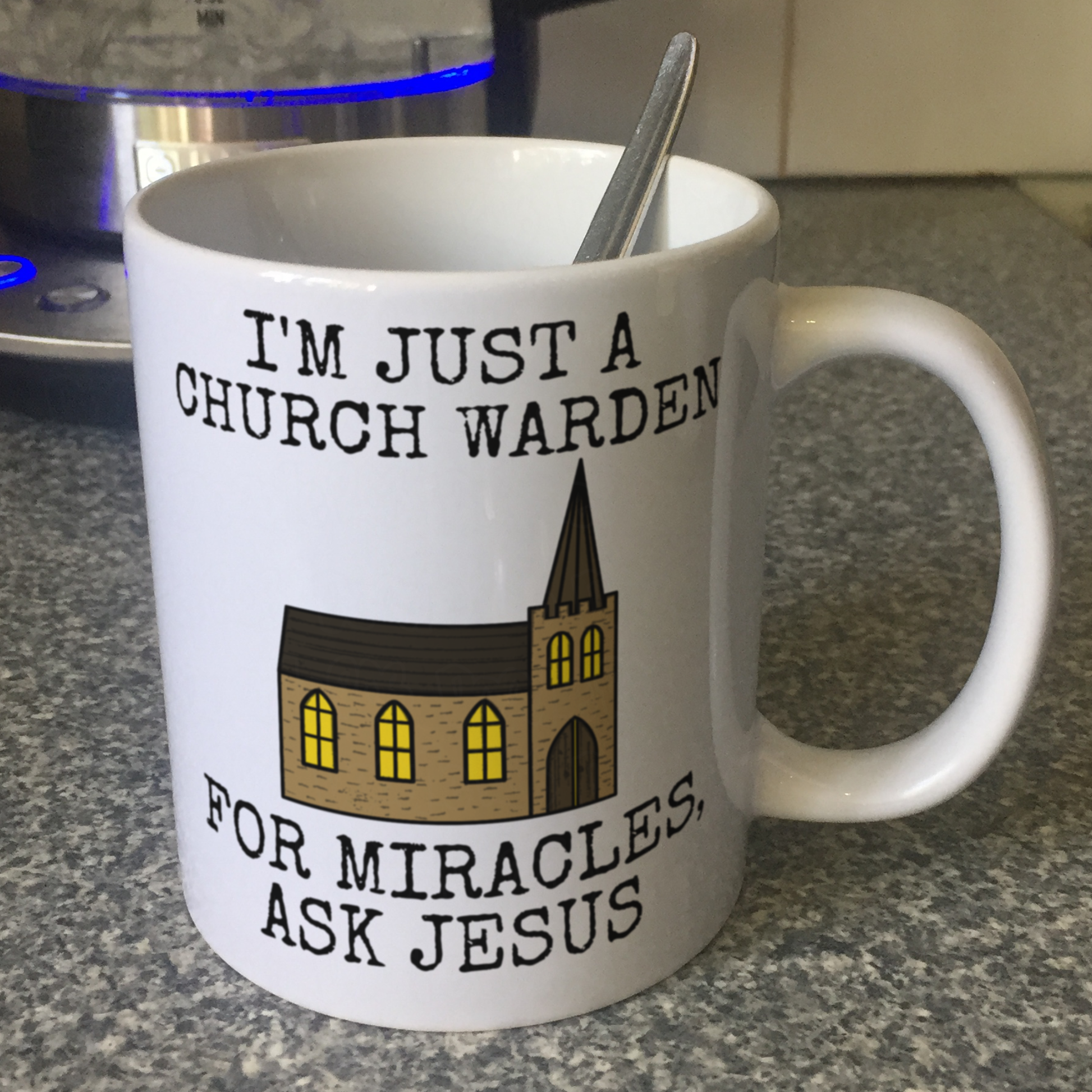 This funny church warden mug features my doodle of a traditional church, with the text "I'm Just A Church Warden - For Miracles, Ask Jesus "! Ideal for church wardens and those who serve in church, this funny church mug is the perfect gift for birthdays, church events or any other occasion!