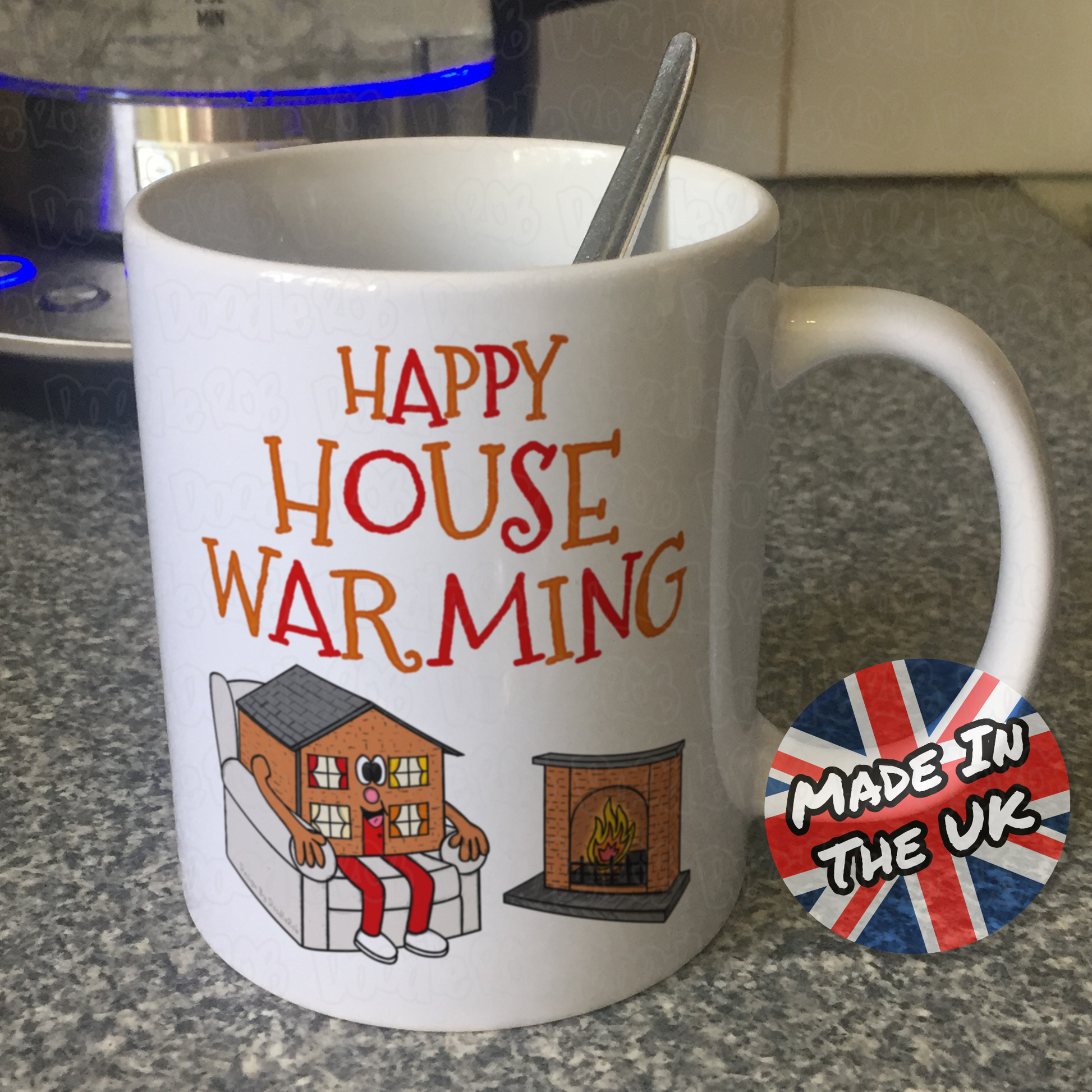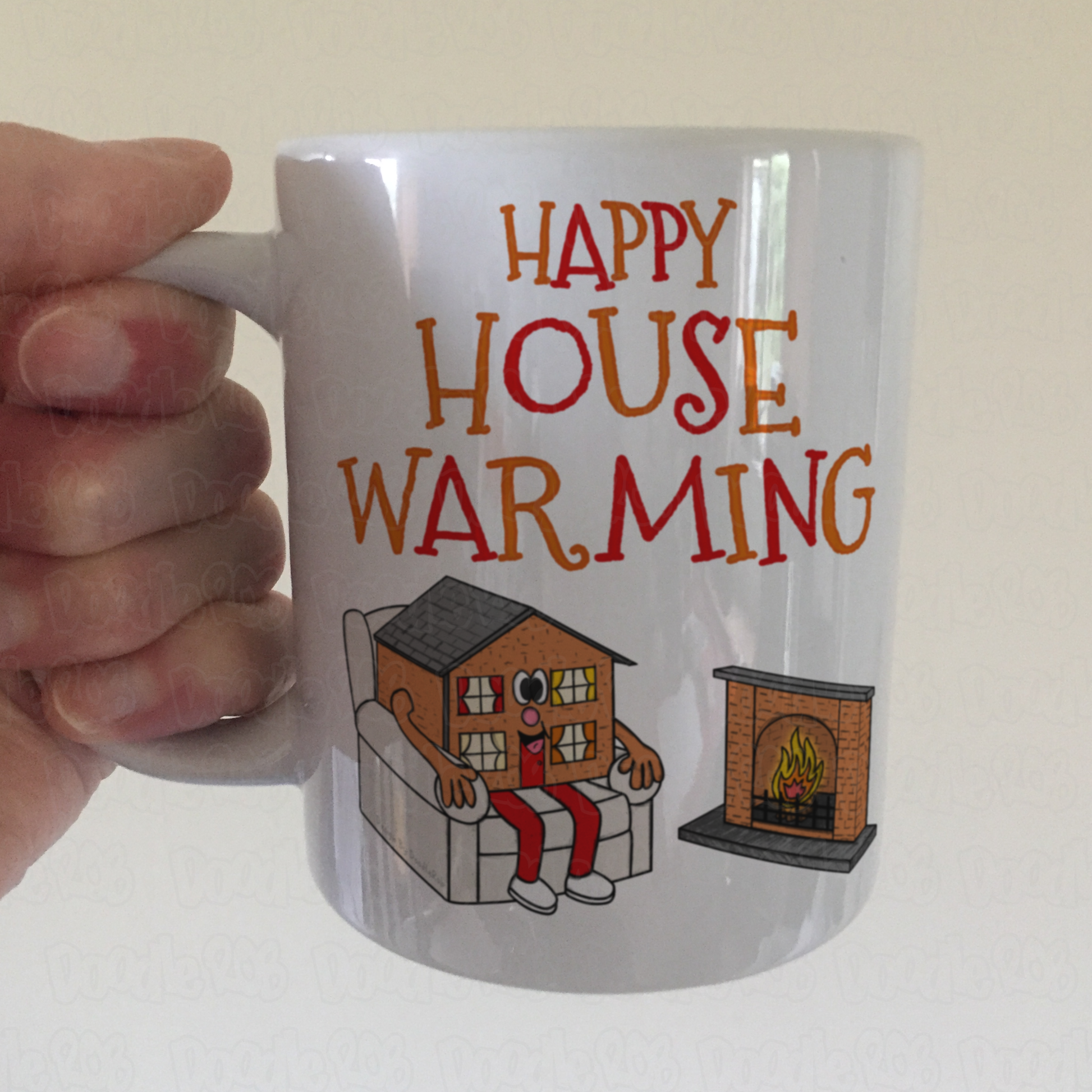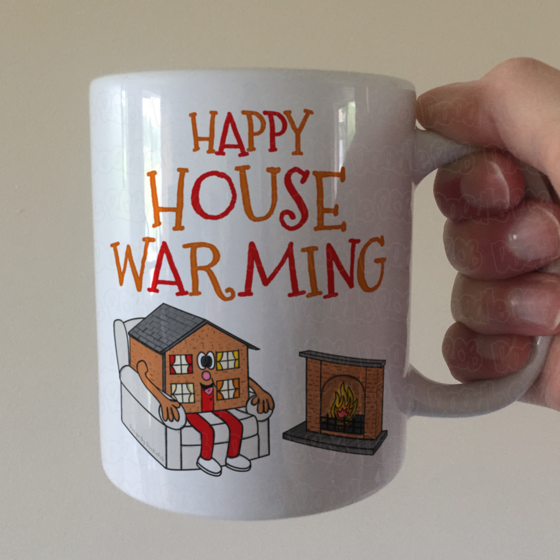 This funny housewarming mug features my doodle of a house sat in front of a fireplace, with the text "Happy House Warming"! Ideal for family and friends who have moved house (especially those with a sense of humour), this mug makes the perfect housewarming (house moving) gift!