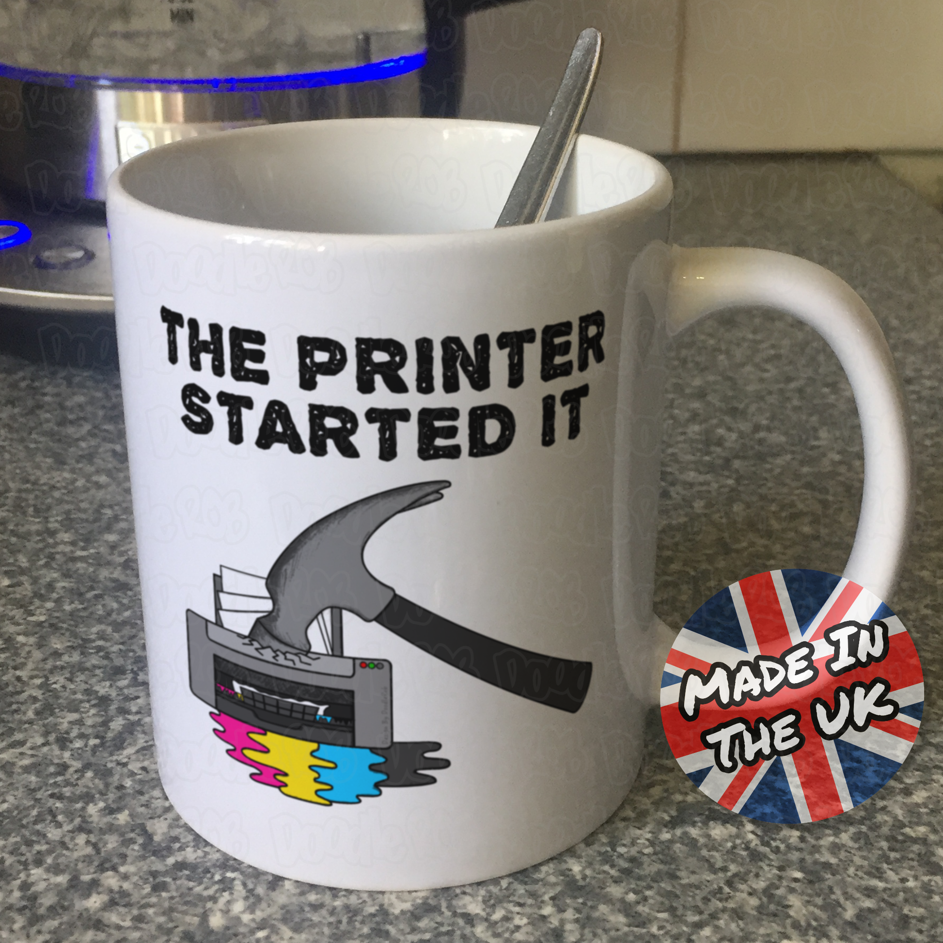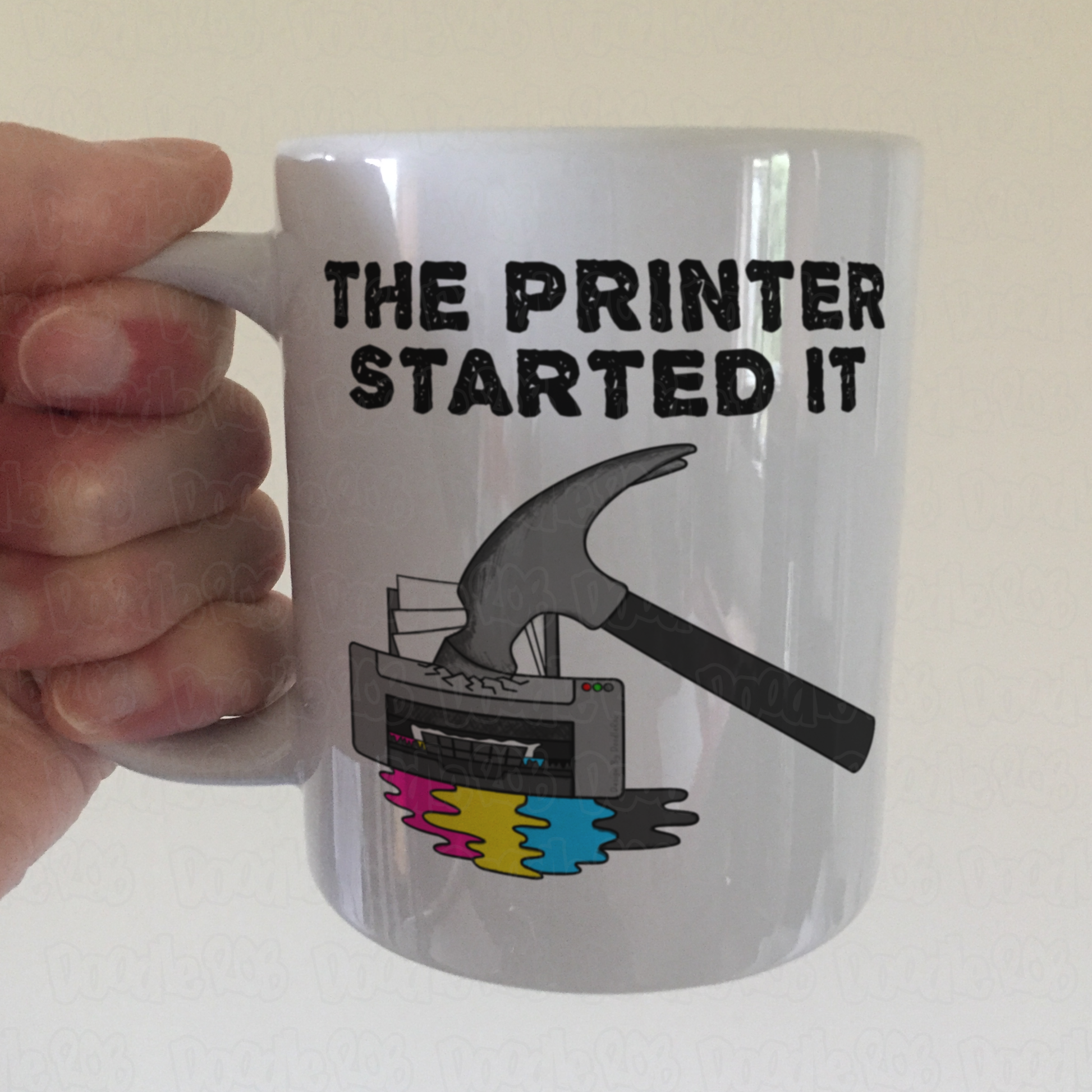 This funny office mug features my doodle of a printer being hit with a hammer, with the text "The Printer Started It"! Ideal for family and friends with a sense of humour (especially Computer/IT technicians), this mug is the perfect gift for birthdays, new job, office secret Santa, or any other occasion!