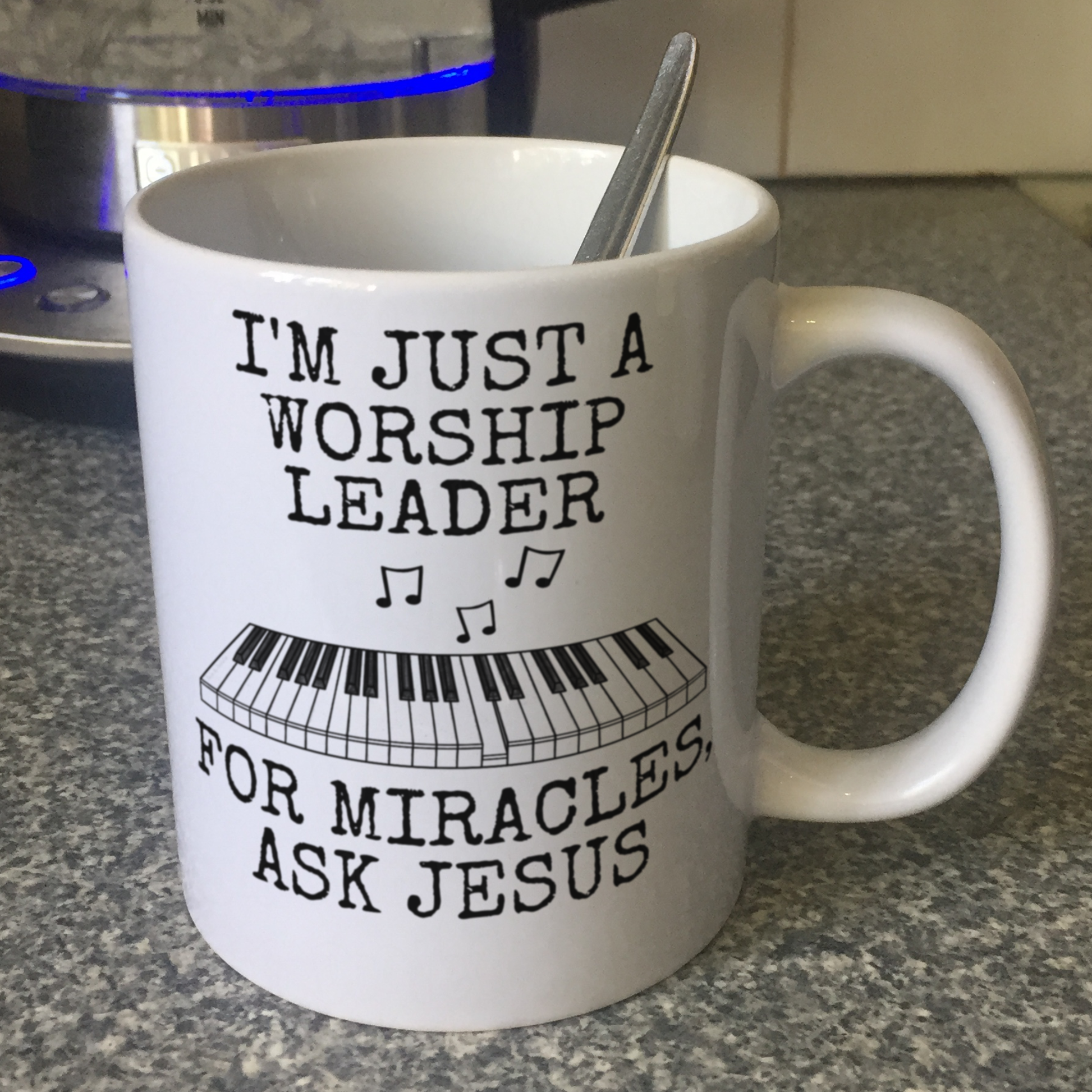 This funny worship leader mug features my doodle of a piano keyboard with musical notes, along with the text "I'm Just A Worship Leader - For Miracles, Ask Jesus"! Ideal for church worship leaders and Christian pianists/keyboard players, this funny church mug is the perfect gift for birthdays, church events or any other occasion!