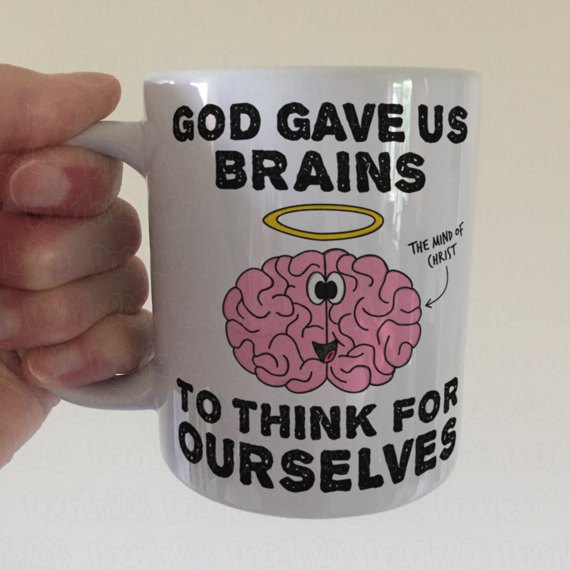This funny Christian mug features my doodle of a brain with a halo (and an arrow saying "The Mind Of Christ") and the text, "God Gave Us Brains, To Think For Ourselves"! Ideal for Christian family and friends with a sense of humour (especially pastors, ministers, theology students and scientists), this mug is the perfect gift for birthdays, church events or any other occasion!
