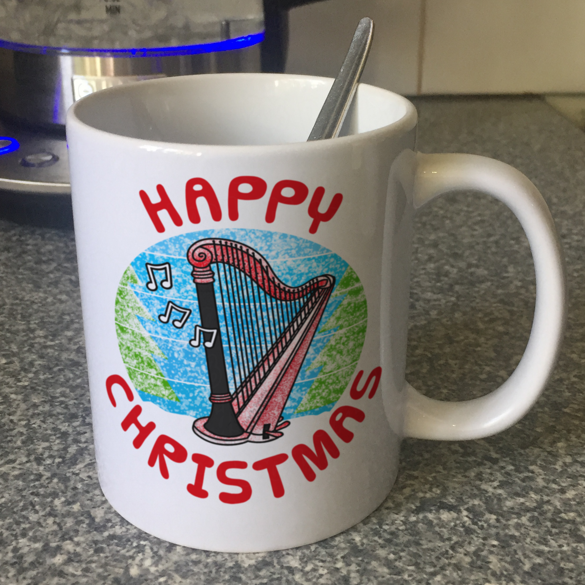 This harp Christmas mug features my doodle of a harp with snow and the text, "Happy Christmas"! Ideal for harp players (harpist, harp student, harp teacher, string player), this mug is the perfect Christmas gift!