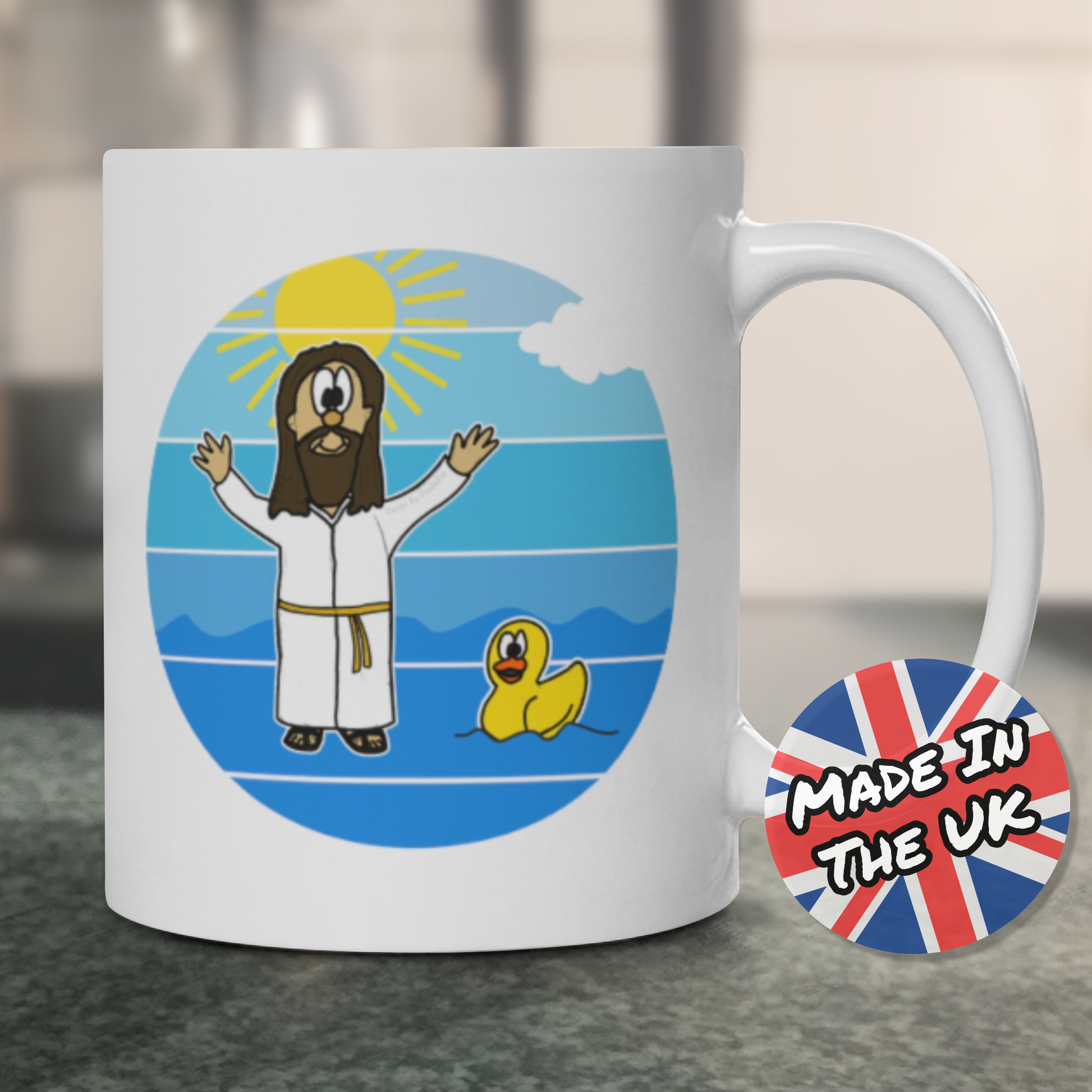 This funny Jesus mug features my doodle of Jesus walking on water alongside a rubber duck! Ideal for Christian family and friends with a sense of humour, this funny Christian mug is the perfect gift for birthdays, baptism, church Summer camp, or any other occasion!