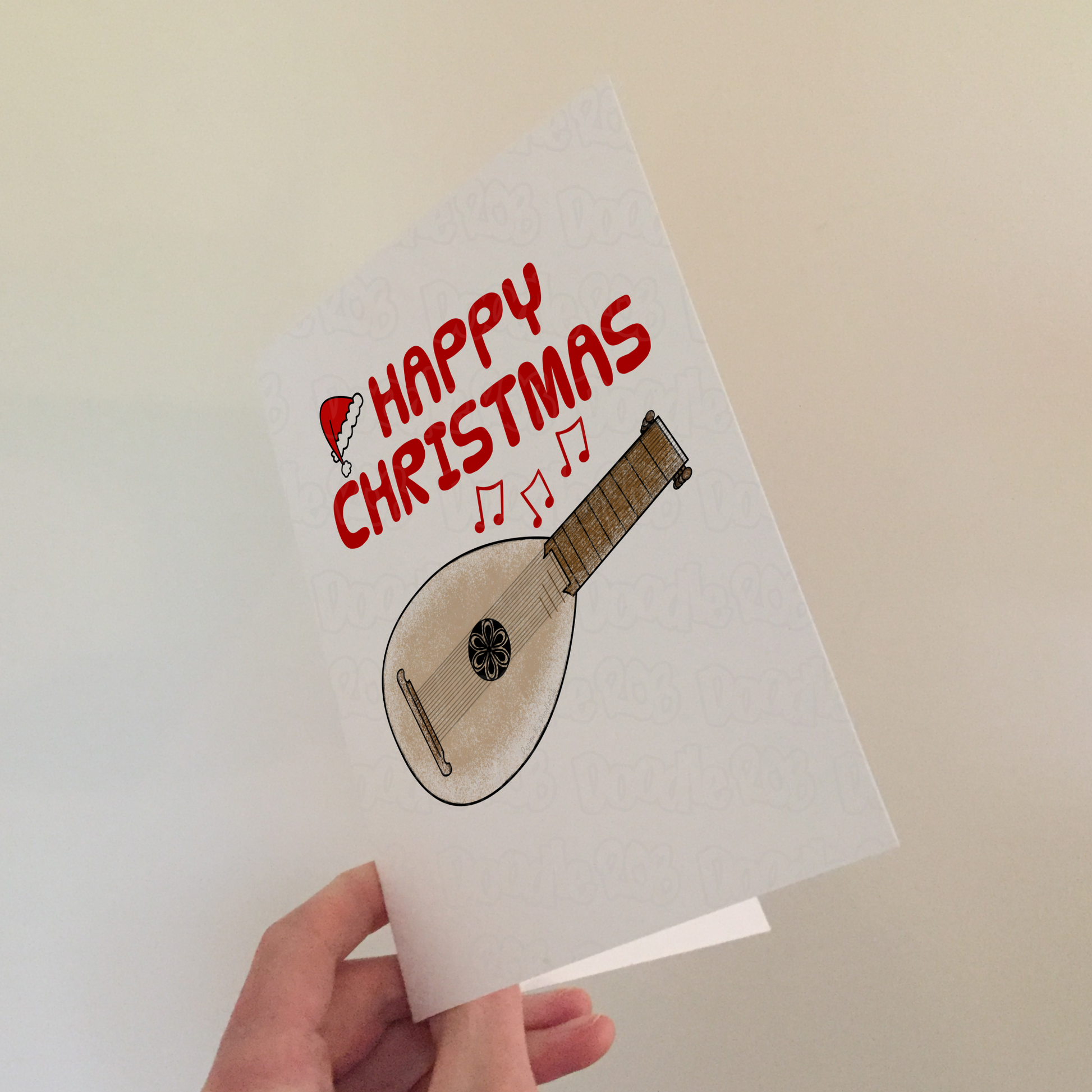 This lute Christmas card features my doodle of a lute, with the text "Happy Christmas" and a Santa hat! Ideal for lute players (lutenist, lute teacher, folk musician) and music lovers!