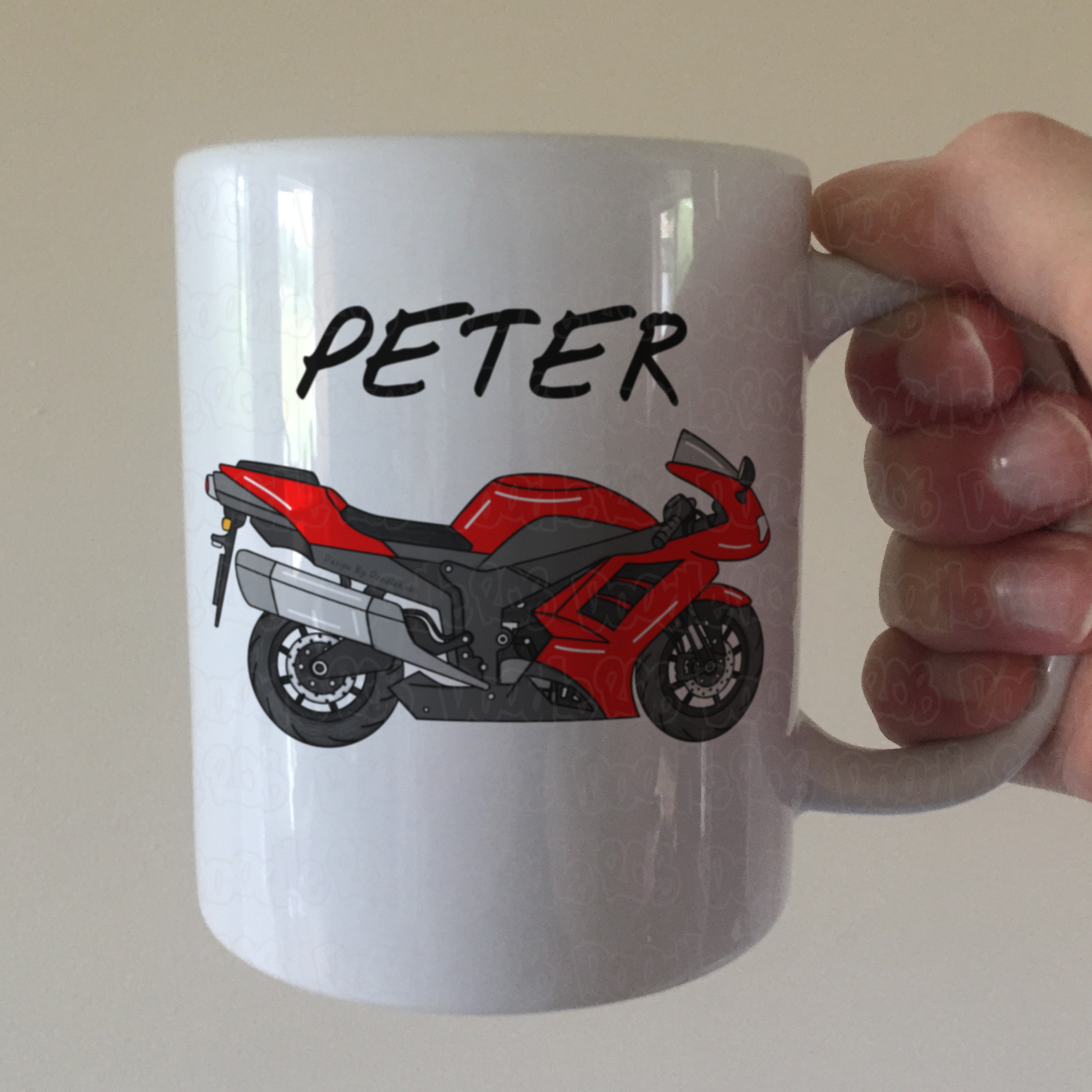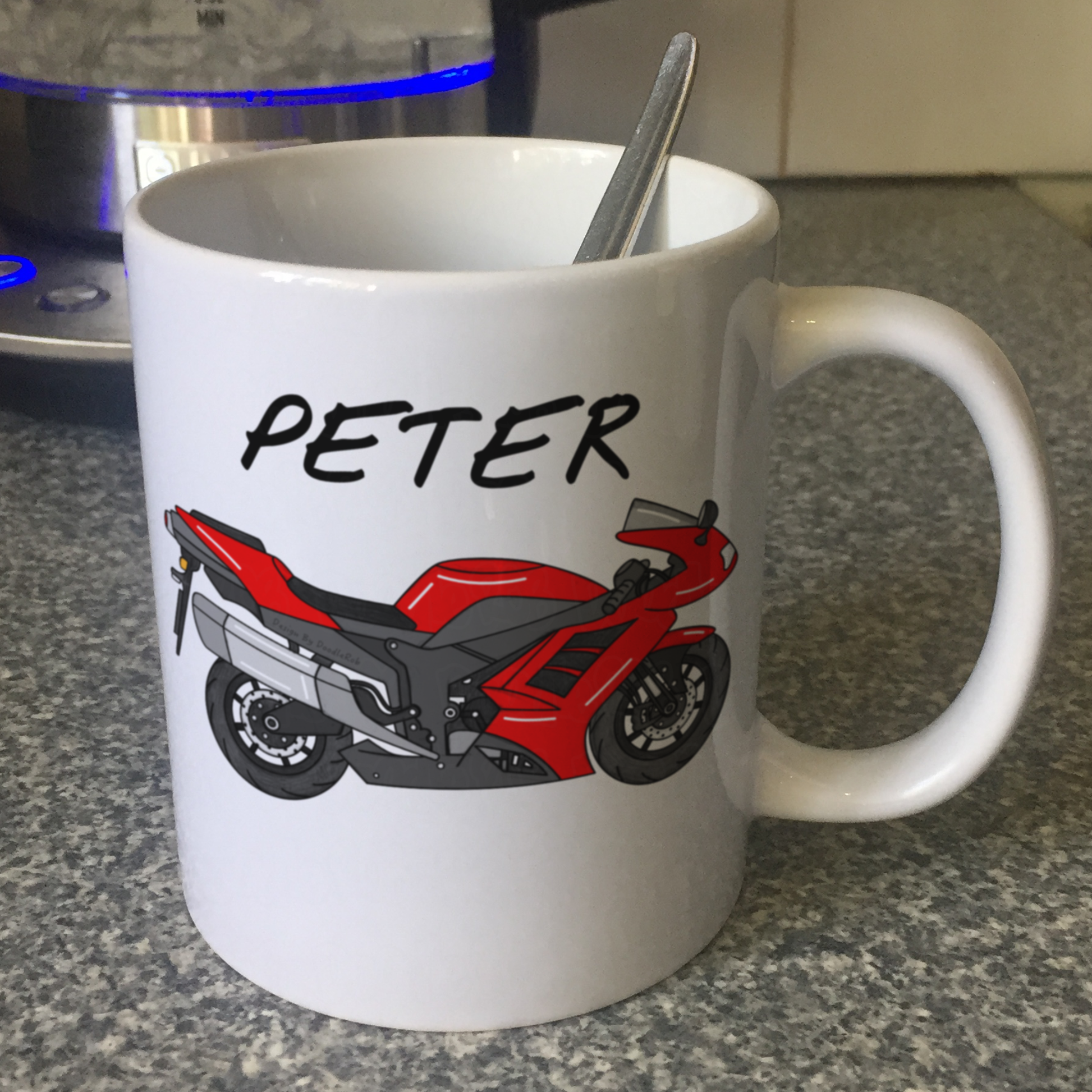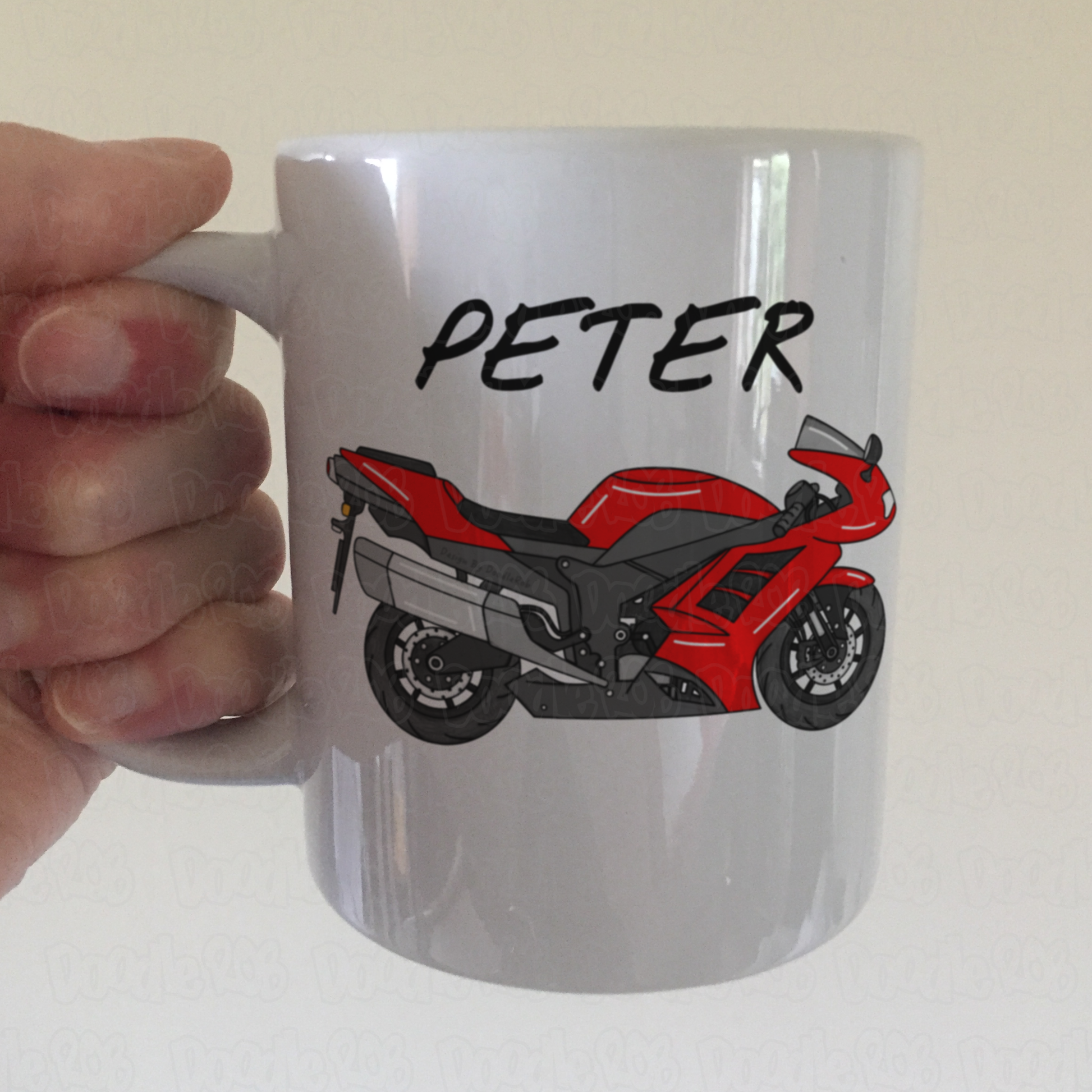 This motorbike personalised mug features my doodle of a motorbike (in red) and personalised text! The perfect gift for bikers and motorcycle enthusiasts!