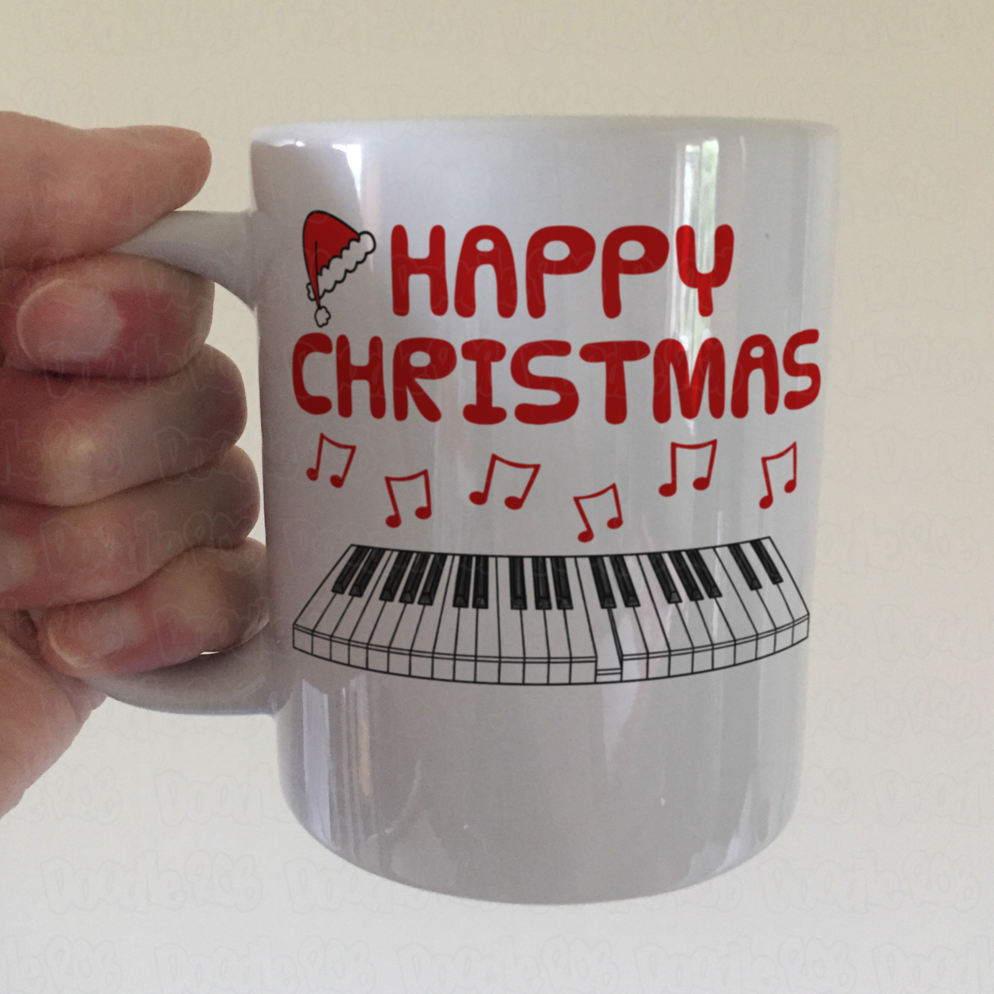 This piano Christmas mug features my doodle of a piano/keyboard, with the text "Happy Christmas" and a Santa hat! Ideal for pianists and keyboard players (piano teacher, keyboard player, keyboardist, organist, synth player), this mug is the perfect Xmas gift!