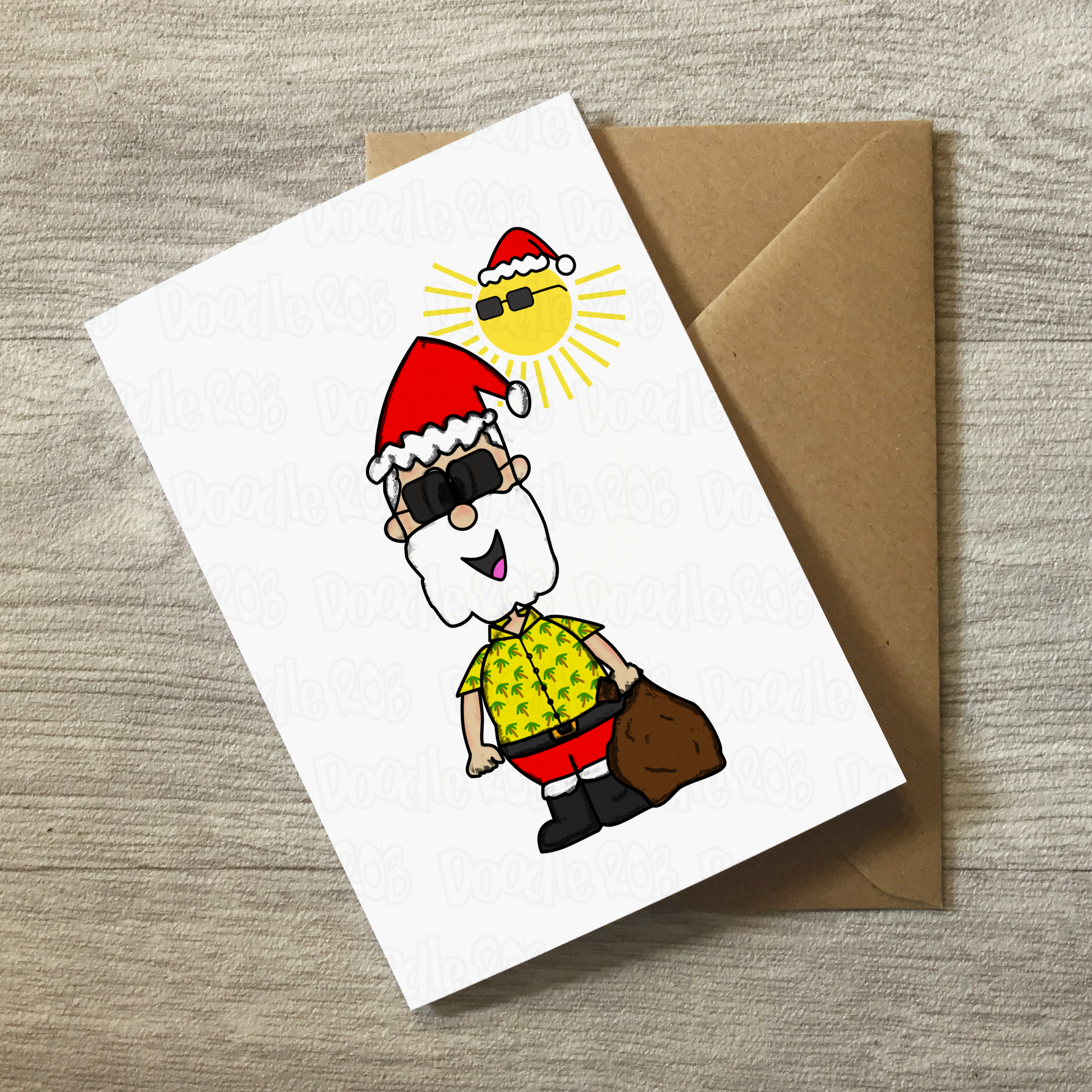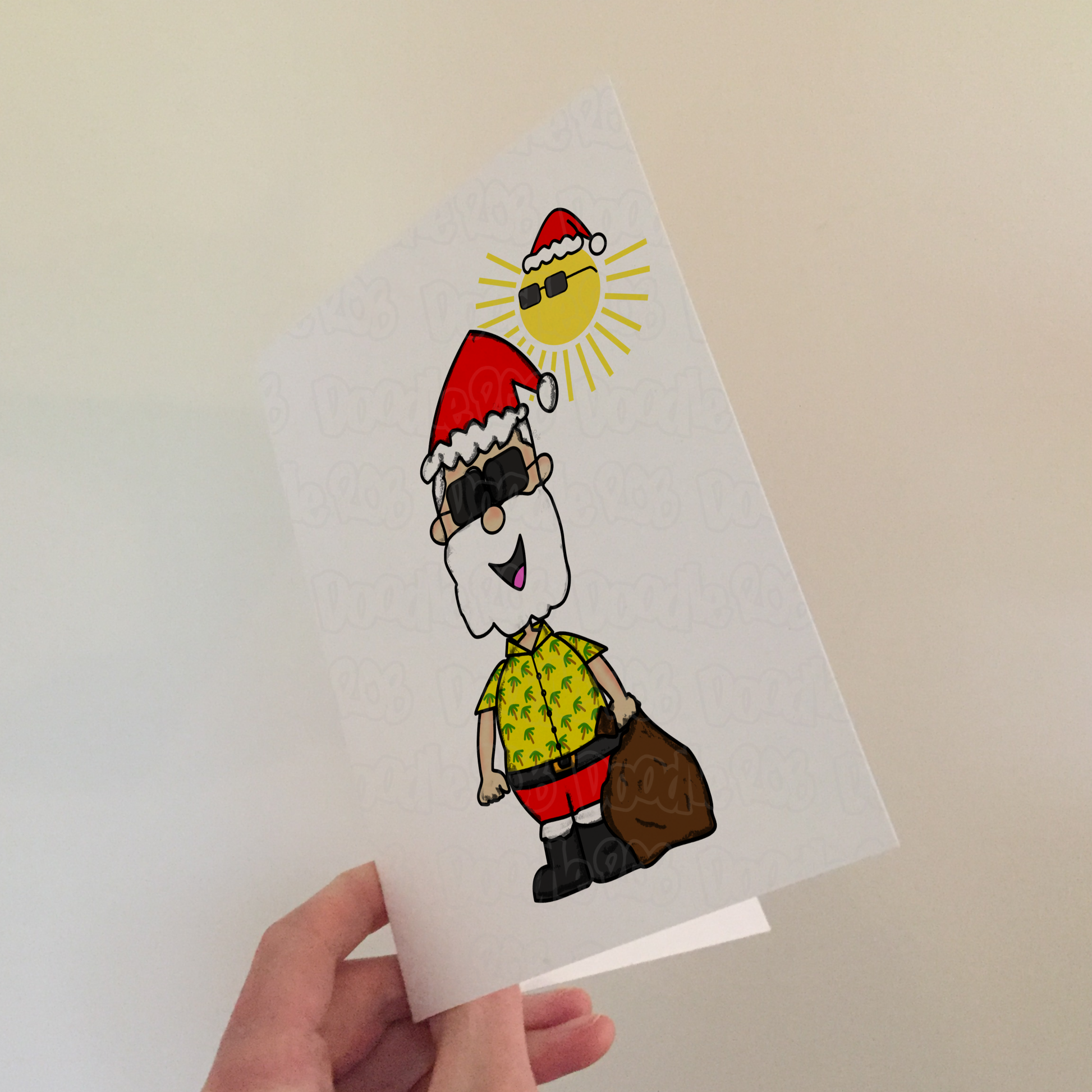 This Santa Claus Summer Christmas card features my doodle of Santa in a Hawaiian shirt and the Sun with a Santa hat! Ideal for family and friends who really love Christmas, this card is perfect for Christmas, Christmas In July, Summer or any other occasion!