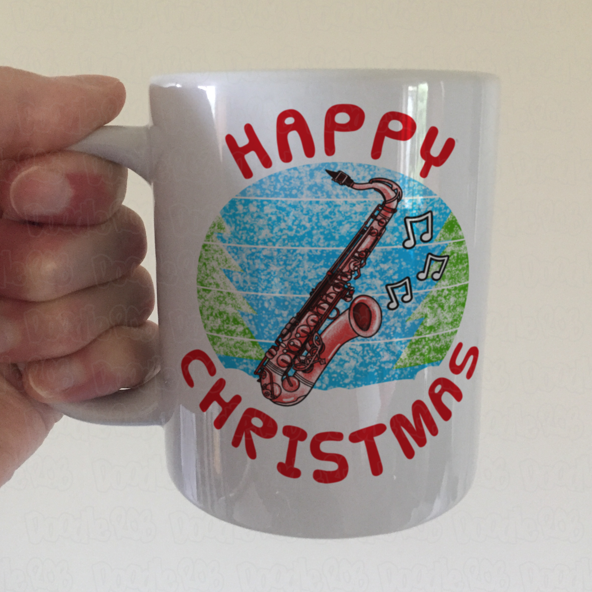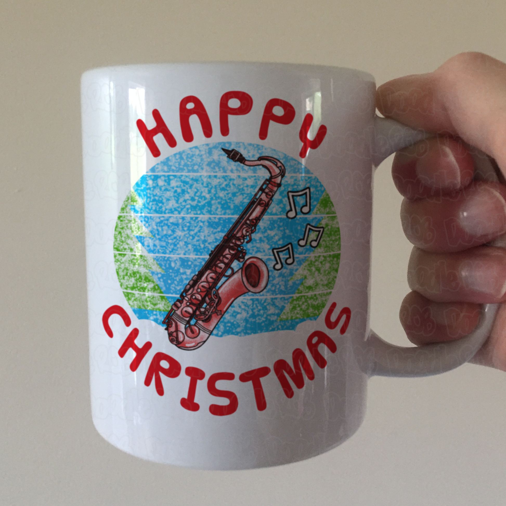 This Christmas saxophone mug features my doodle of a saxophone, with snow and the text "Happy Christmas"! Ideal for family and friends who play saxophone (saxophonist, saxophone teacher, string musician), this saxophone mug is the perfect Christmas gift!