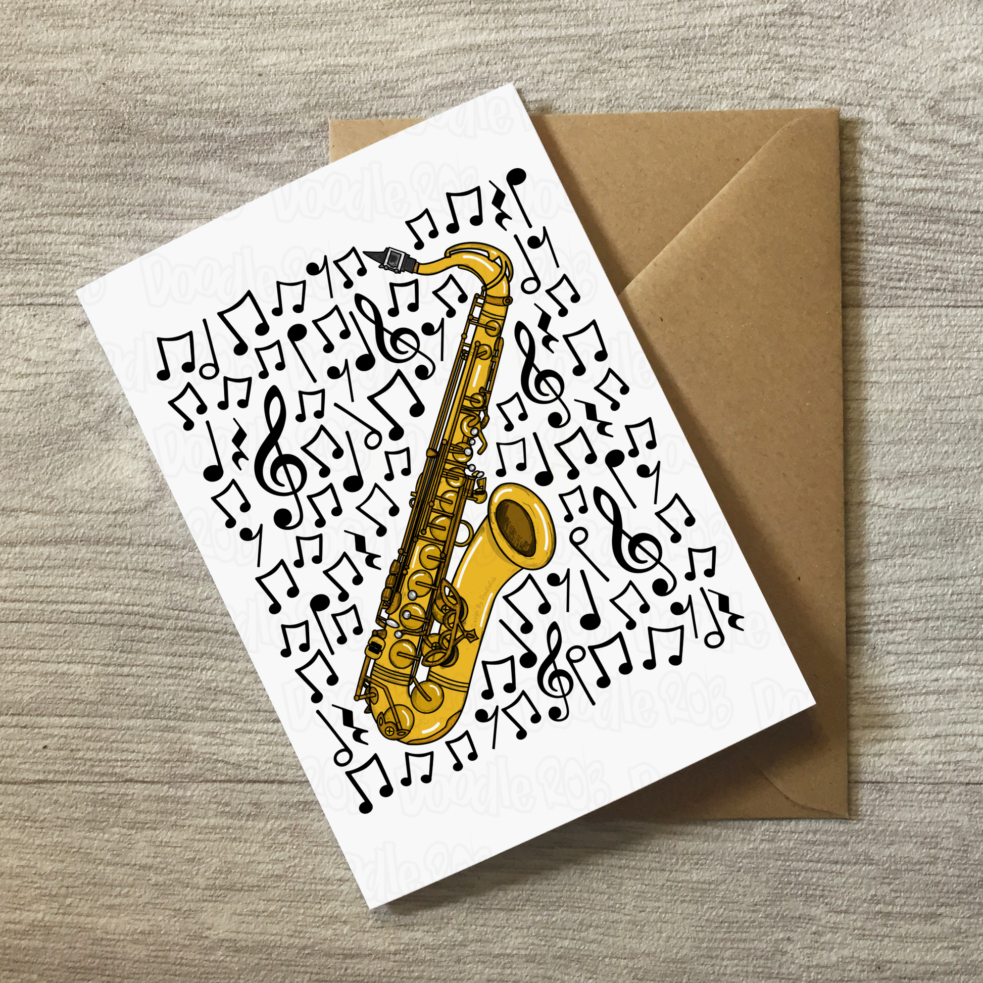 This saxophone greeting card (saxophone birthday card) features my doodle of a saxophone, surrounded by musical notes - ideal for saxophone players (saxophonist, saxophone teacher, sax player) and jazz music lovers! Blank inside for your own message, this card is perfect for birthdays, teacher thank you, music exams, or any other occasion!