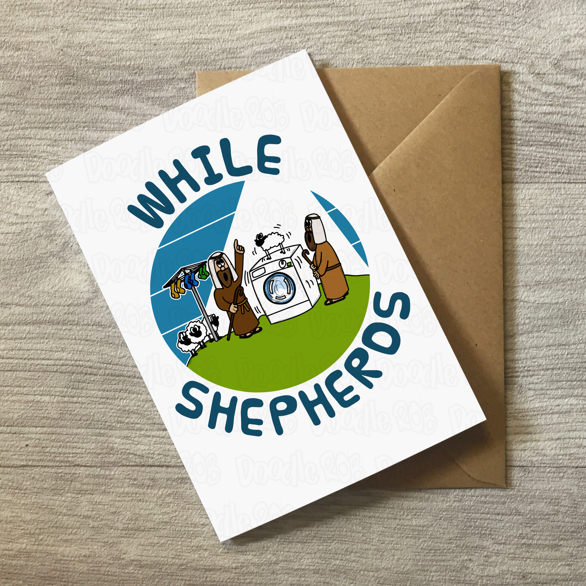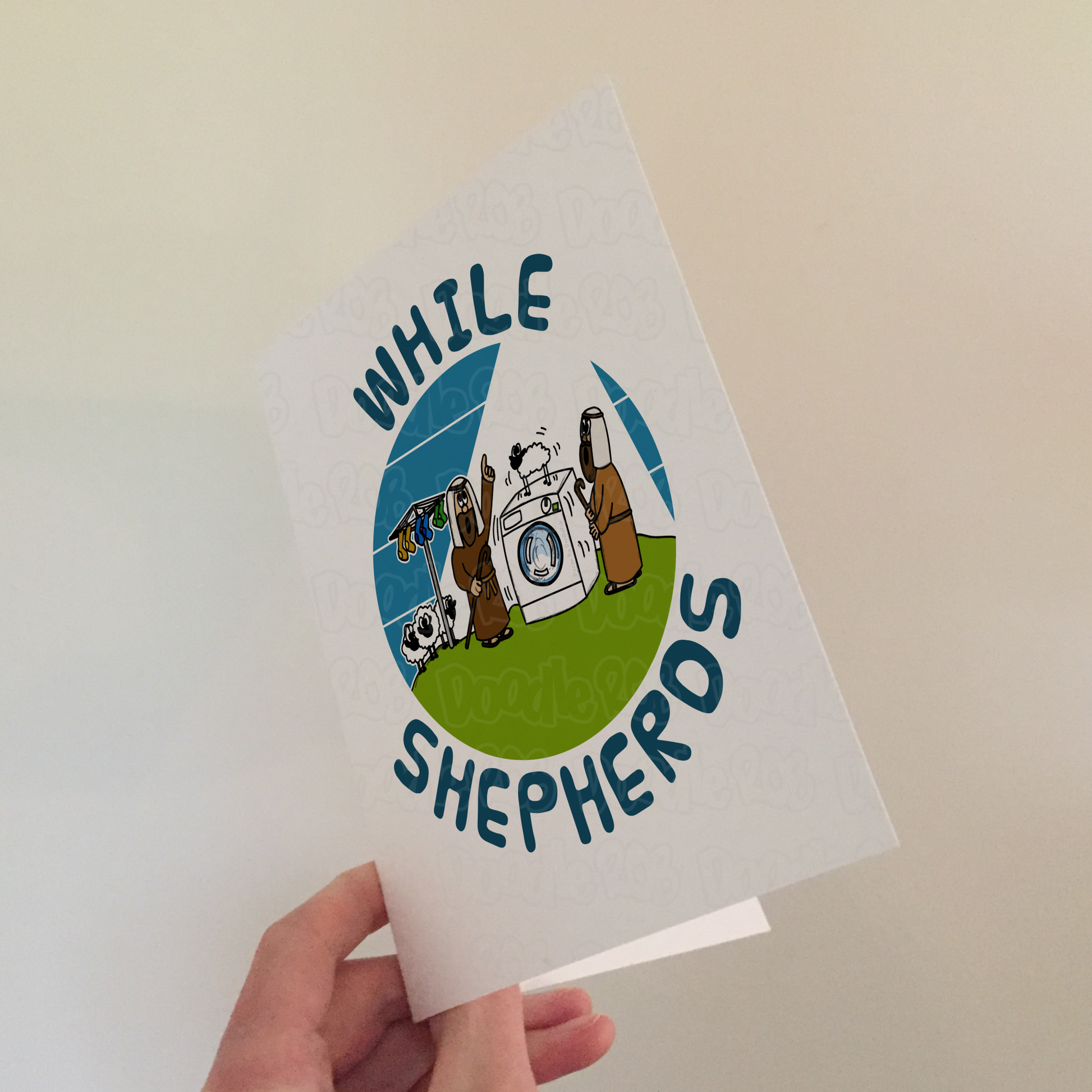 This Christmas Shepherds card features my doodle of the Christmas shepherds (with a washing machine, washing line and sheep) and the text "While Shepherds"! Inspired by a well known Christmas carol, it's ideal for Christians with a sense of humour! The perfect Christmas card for family and friends who love Christmas, Nativity, carol singing and love to laugh - especially carol singers and church ministers (pastor, priest, vicar, church musicians)!