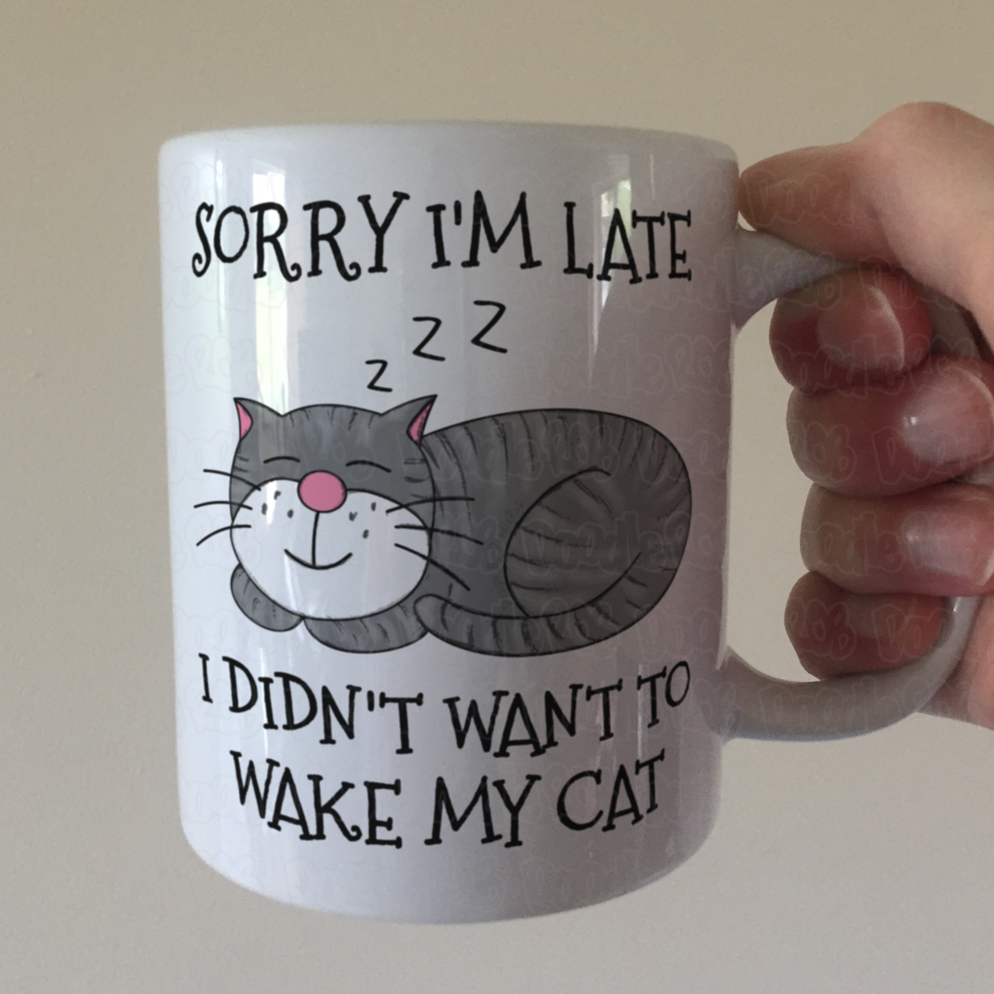 This sleeping cat mug features my doodle of a grey cat asleep, with z's and the text "Sorry I'm Late, I Didn't Want To Wake My Cat"! Ideal for family and friends who love cats and have a sense of humour, this mug is the perfect gift for birthdays, teacher appreciation, retirement, work event (office secret Santa), or any other occasion!