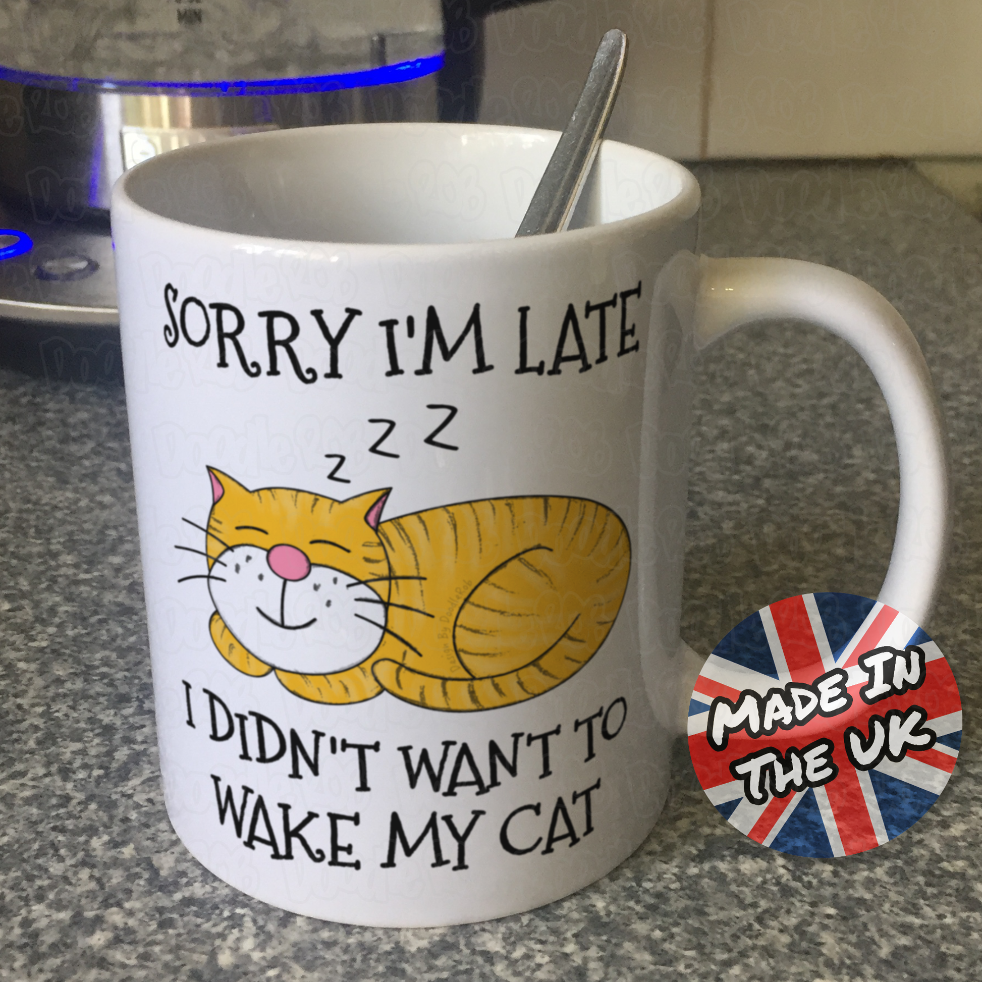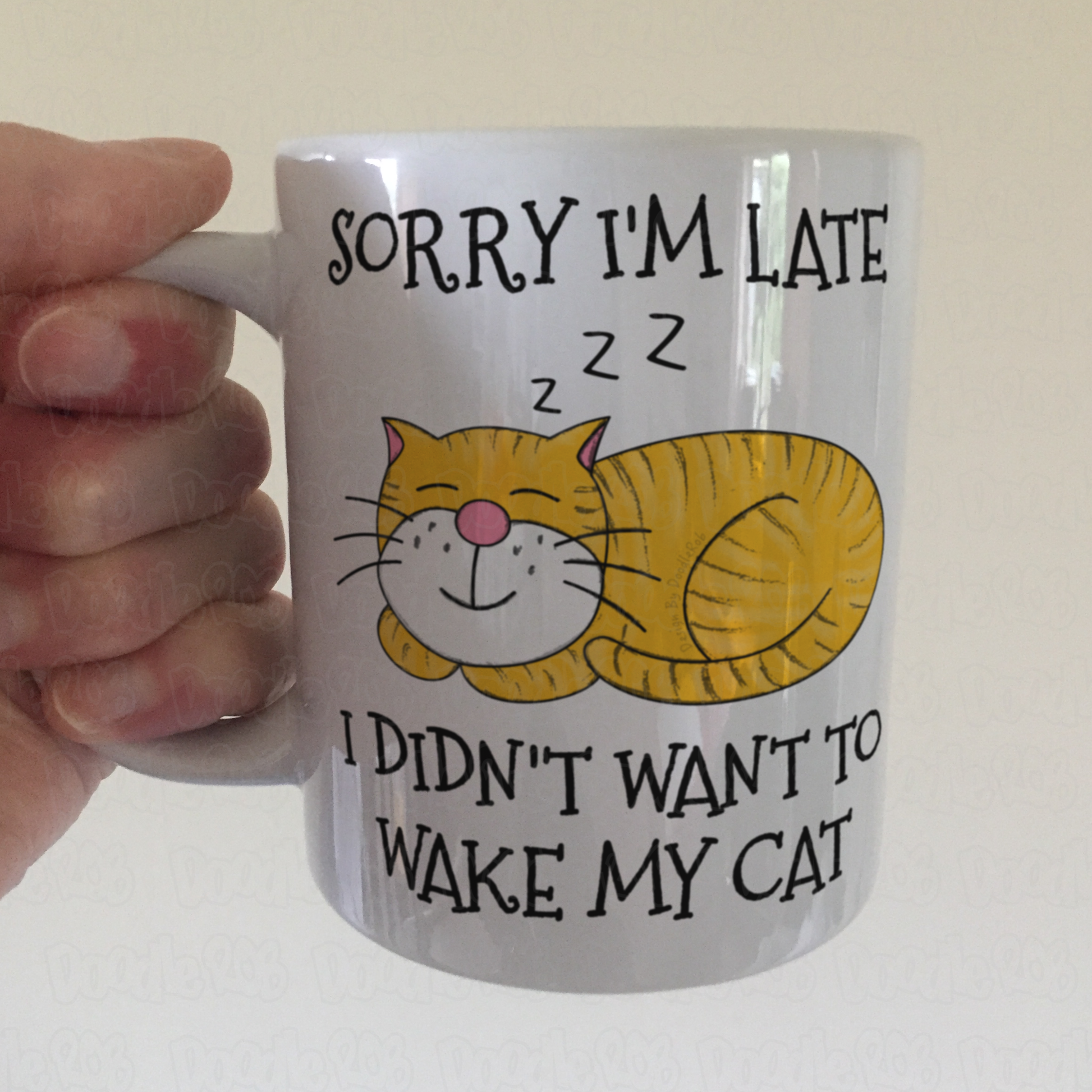 This sleeping cat mug features my doodle of a cat asleep, with z's and the text "Sorry I'm Late, I Didn't Want To Wake My Cat"! Ideal for family and friends who love cats and have a sense of humour, this mug is the perfect gift for birthdays, teacher appreciation, retirement, work event (office secret Santa), or any other occasion!