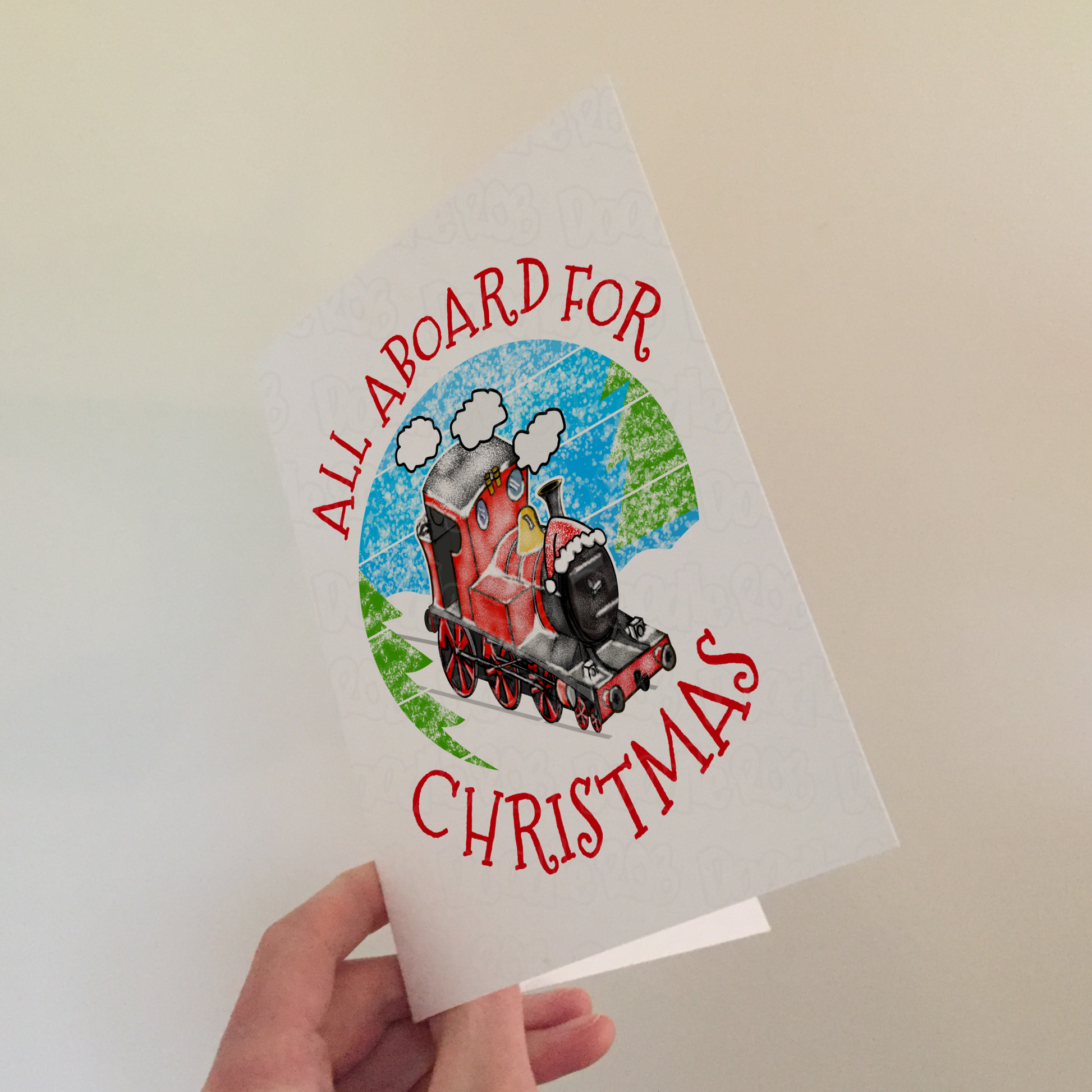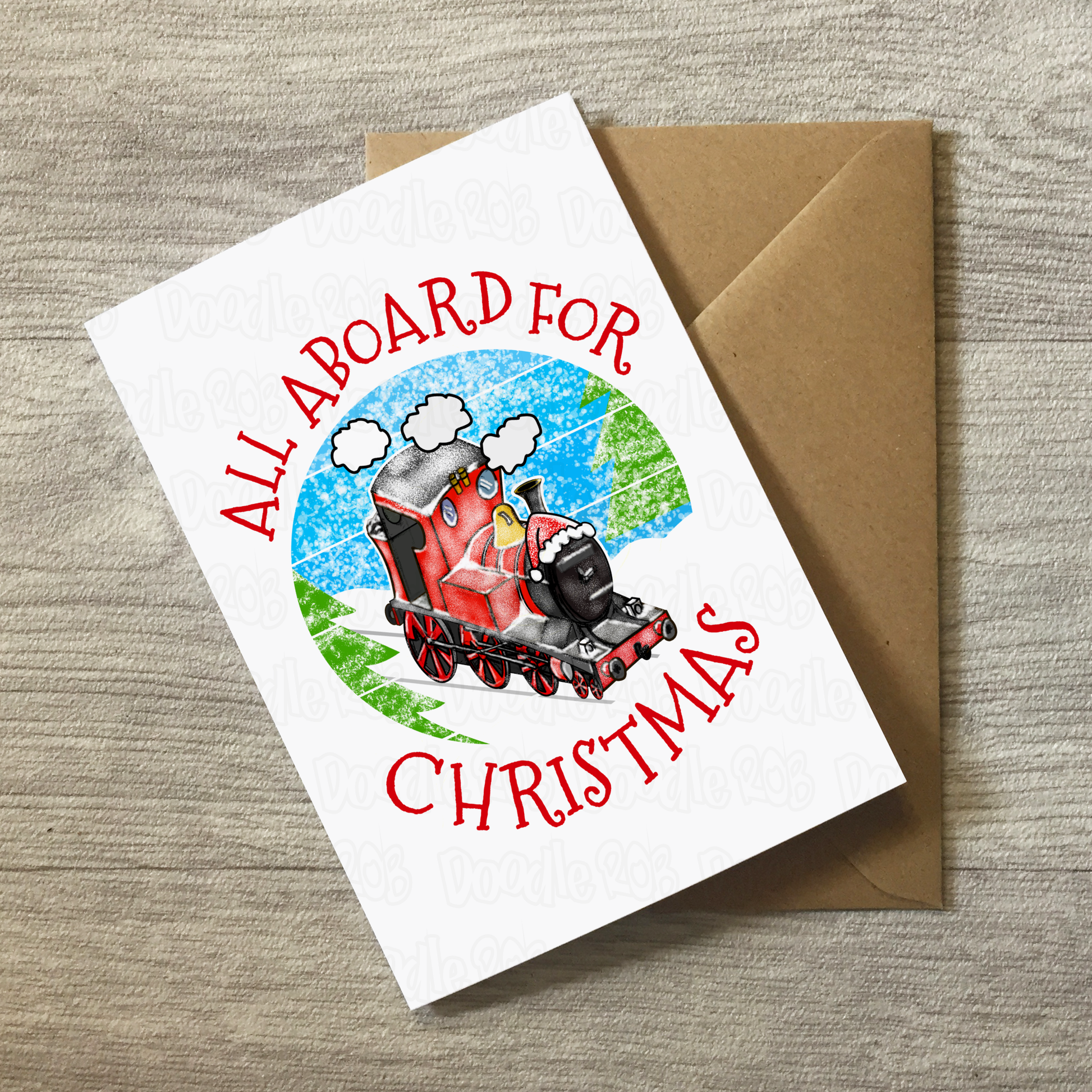 This steam train Christmas card features my doodle of Christmas steam train (in red), with the text "All Aboard For Christmas"! The perfect Christmas card for boys and men who love trains (railway enthusiast, model railway)!