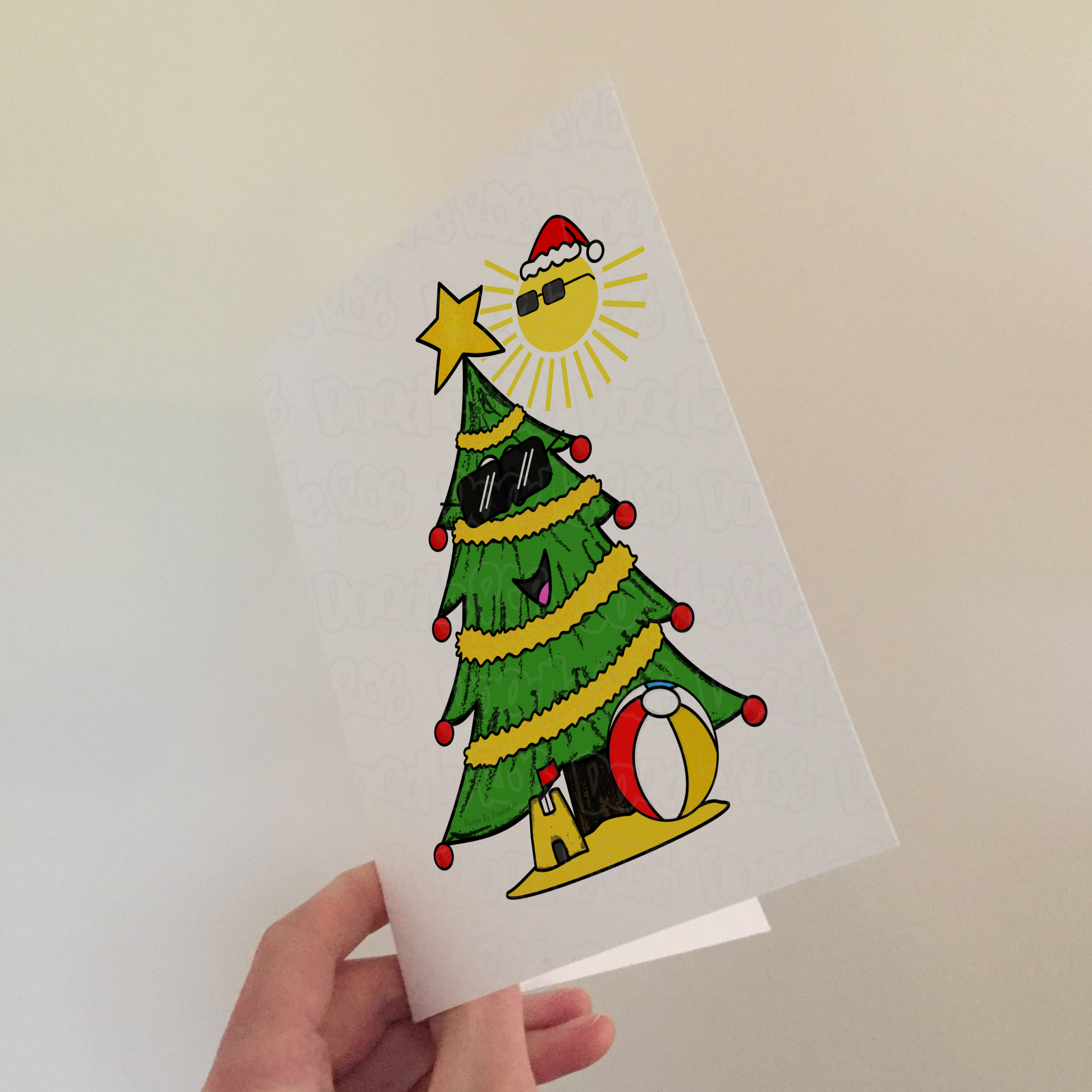 This Summer Christmas tree card features my doodle of a Christmas tree on the beach (with sandcastle and beach ball) and the Sun with a Santa hat! Ideal for family and friends who really love Christmas, this card is perfect for Christmas, Christmas In July, Summer or any other occasion!